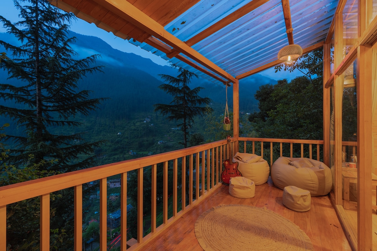 Glamoreo, just 1 hour away from Shimla. Stunning walnut wood interior, including all the furniture. Outdoor wooden bathtub, perfect for soaking in the fresh mountain air. The surrounding area is open and spacious. You can walk around, take in the scenic views, and get a feel for rural life. Everything here is organic, from food to dairy products. If you don’t feel like home-cooked meals, there are cafes and restaurants just 3–4 km away, and you can either visit them or have food delivered