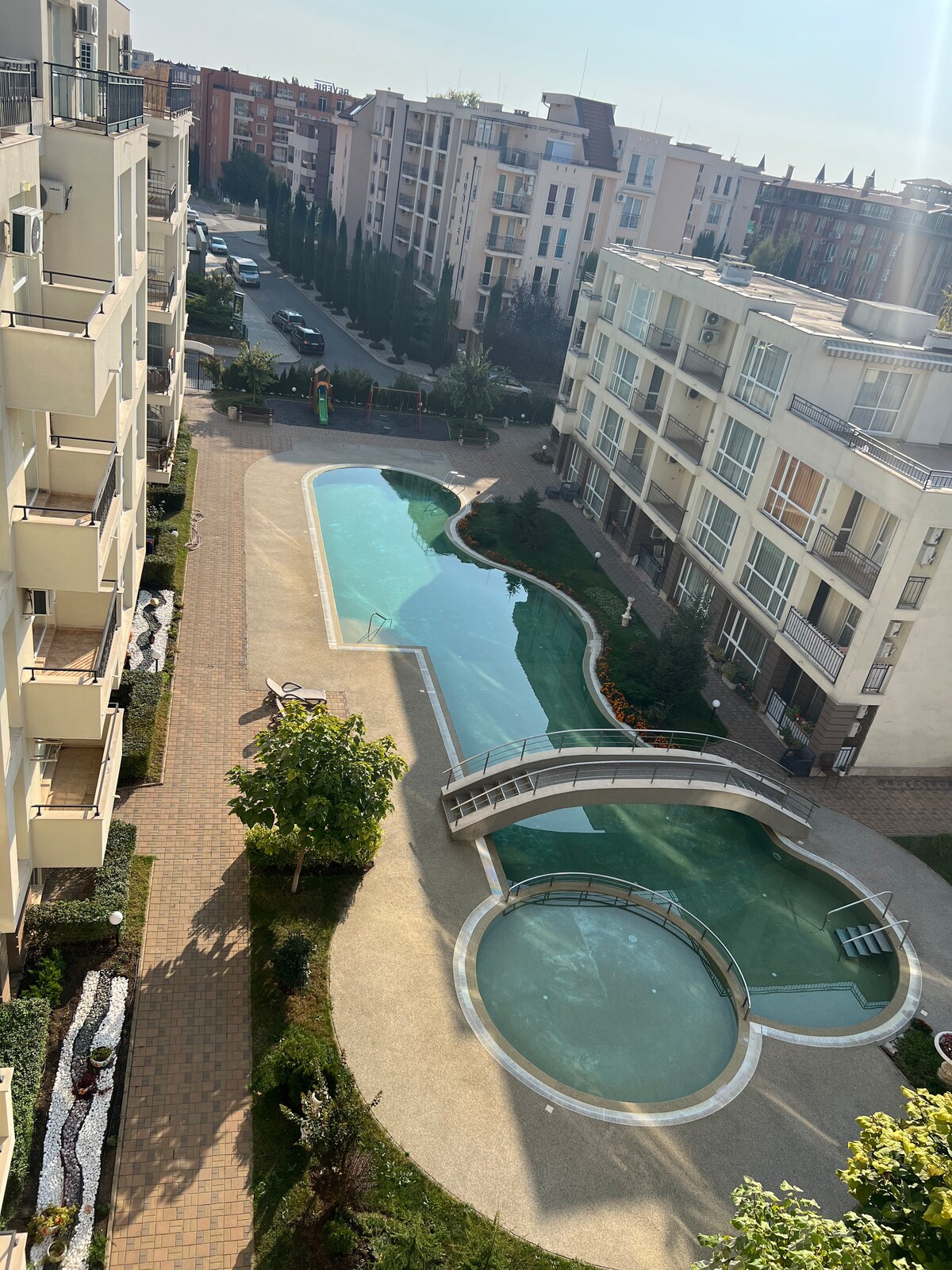Goed onderhouden en schoon complex met twee gratis zwembaden voor volwassenen en kinderen. Waterbar, kinderspeeltuin, tennisbaan, voetbalveld, op 5 minuten lopen van het strand. Bushalte supermarkten 24 uur apotheek, zeer rustige en vredige omgeving