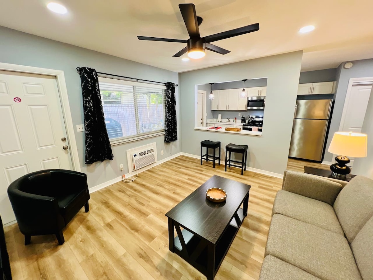 Ruim appartement met één slaapkamer en één badkamer dicht bij alles. Primaire slaapkamer heeft een kingsize bed en een inloopkast. Mooie uitgeruste keuken. Twee privé omheining in zithoeken. WIFI EN tv inbegrepen. Gedeelde wasruimte. Op loopafstand van Whole Foods, Maritime Academy en restaurants. Dicht bij strand, Las Olas, cruisehaven, luchthaven, nachtleven en Broward Hospital. Parkeer aan de overkant van de accommodatie met schommels, glijbanen en banken. Gezins- en huisdiervriendelijk. Geen klusjeslijst om uit te checken!