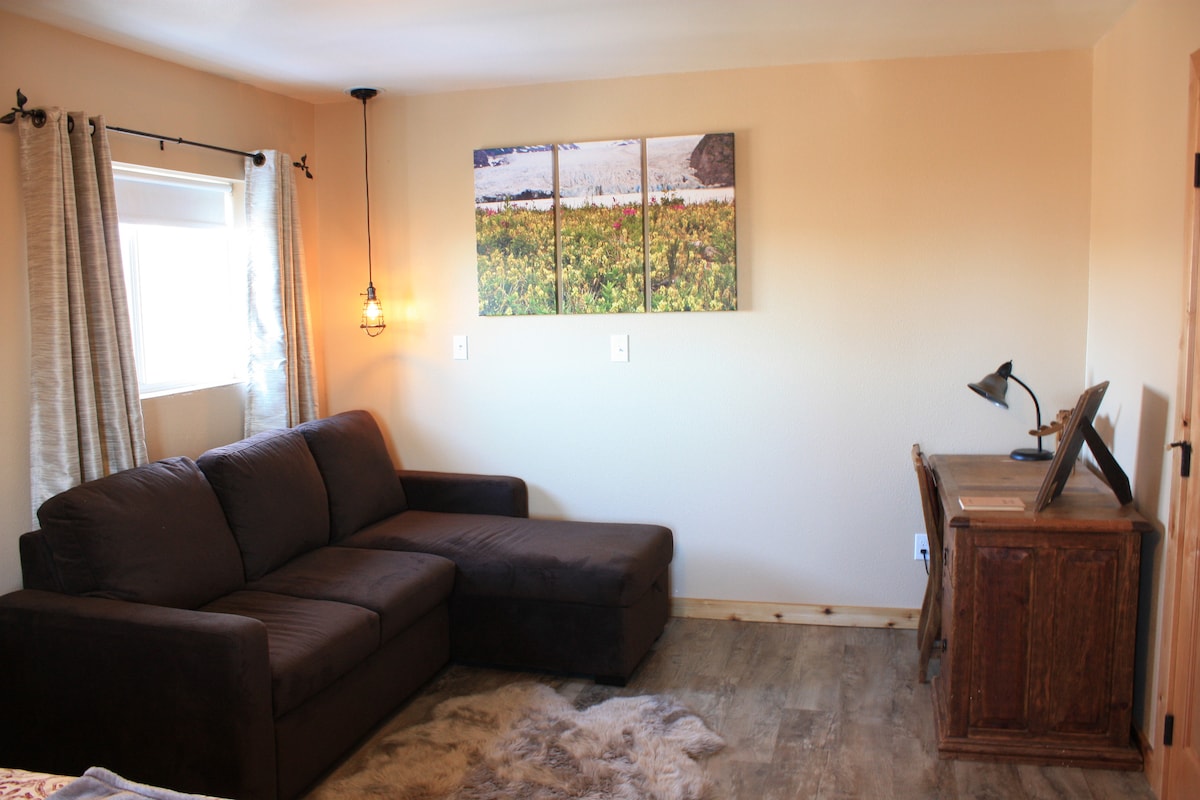 Licht, modern, schoon en dicht bij Palmer en Wasilla, belangrijke wegen en Hatcher Pass-paden, deze kelderwalkout-studio is een perfecte tussenstop of thuisbasis. Je zult genieten van - Een modderkamer voor spullen, keuken met koffie/room/thee/haver en badkamer met douche. Slaapplaats voor 4 personen - 2 eenpersoonsbedden samengevoegd, uitklapbare bank en vloermatras. Wasserette, tv, wifi, eetpatio met uitzicht en toegankelijkheid van het pad. 1 uur naar Anchorage, 15 minuten naar steden, 5 minuten naar paden. Vraag naar leenhengels (2)!