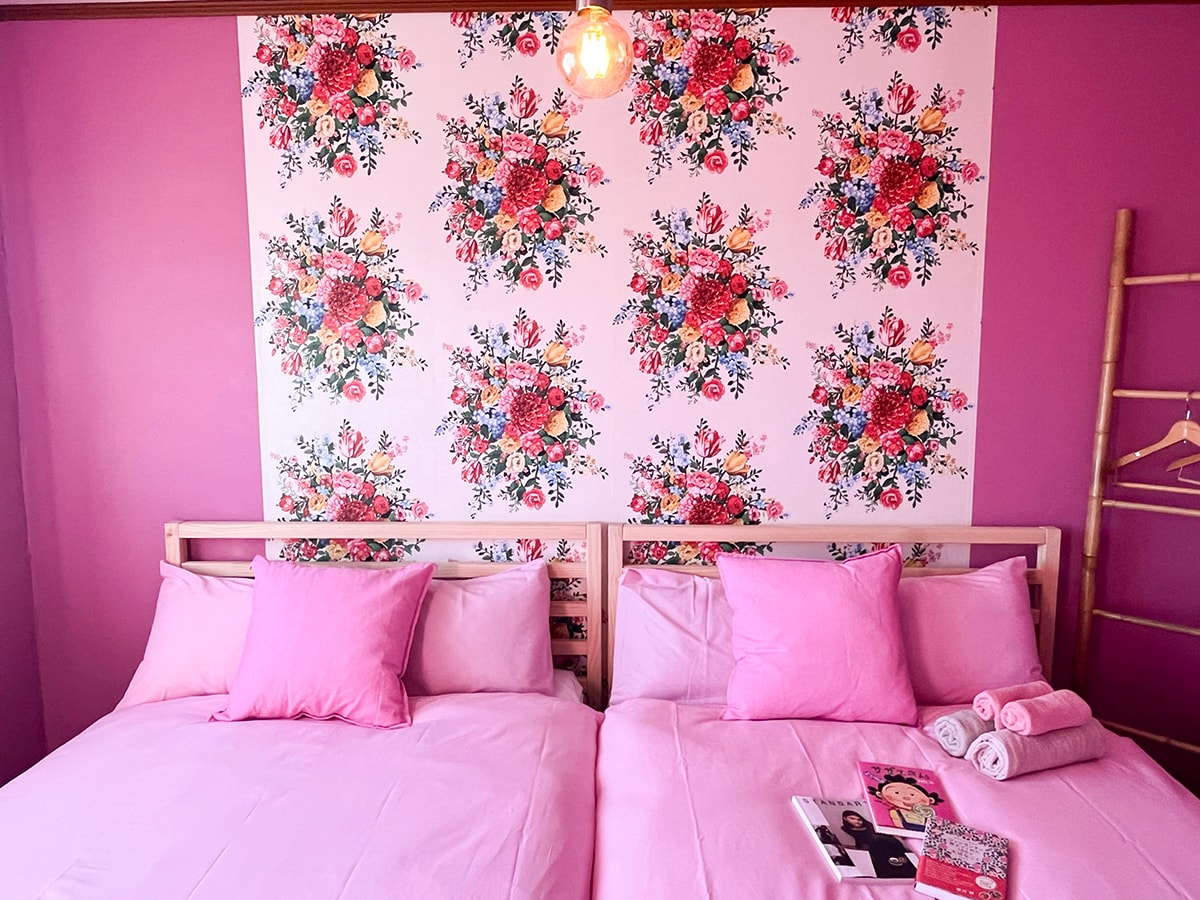 2 kamers te huur: Bali-stijl kamer 201 op de 2e verdieping van een professionele shop, en witte en rode loft kamer 202, lounge met keuken