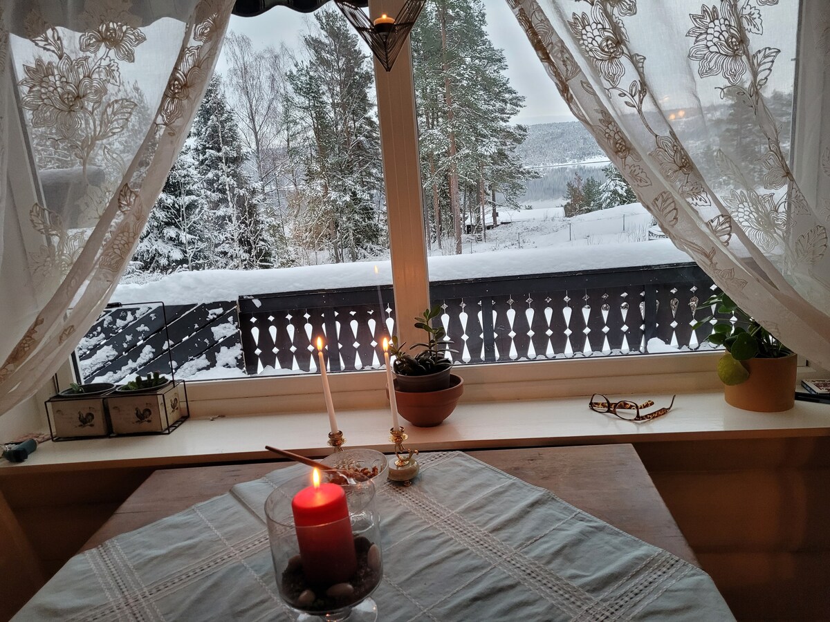 Bekijk de seizoenen veranderen vanuit je bed en ontspan in mijn luxe appartement op de bovenste verdieping met een prachtig uitzicht op het Pollevann-meer en het Noorse natuurreservaat! Dicht bij avontuur: 6 minuten rijden of bus naar Tusenfryd, 10 minuten lopen naar Oslo/Tusenfryd bus (26 minuten naar Oslo S), en naar zoetwaterzwemmen. Fjordstranden liggen op 5 minuten rijden. Mooi wandelgebied. Geniet van de Marokkaanse inrichting, een Nespresso op het balkon en de nabijgelegen speeltuin. Verken de oude Nøstvedt Stone Age-site en een BBQ-hut op slechts een steenworp afstand.