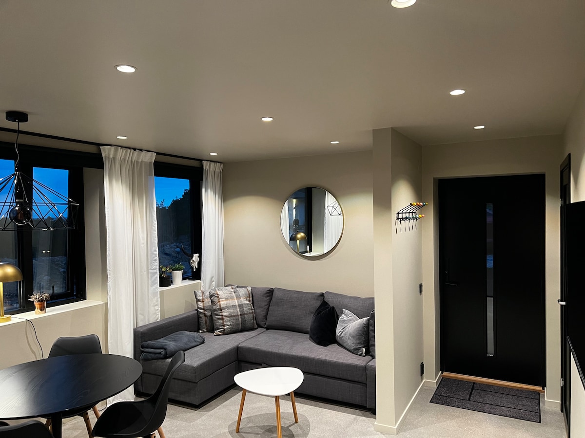 Keuken en woonkamer met een slaapbank van 155 cm en uitzicht op zee. Grote slaapkamer met een tweepersoonsbed van 160 cm. Keuken met oven/inductiekookplaat, koelkast/vriezer, vaatwasser en magnetron. Badkamer met douche, wasmachine en droger. Balkon en groot terras met gras. Parkeren buiten. 10 minuten lopen naar het water met stranden, kliffen en jachthaven, bos 1 minuut achter het huis. 15 minuten rijden naar het centrum, 10 minuten naar Nordby winkelen. 20 minuten naar Koster met de boot. Rustige omgeving.