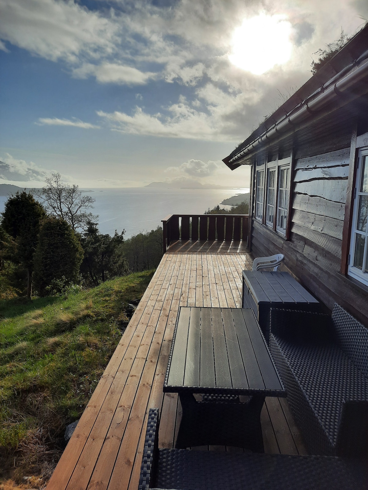 Hytte med stor terrasse og flott panoramautsikt i et naturskjønt område. Fra hytten er det fantastisk utsikt til både fjord og fjell med isbre. Her kan du stresse ned og nyte fritiden. Fine turmuligheter rett utenfor døren og i nærområdet. Hytten er nylig oppusset med nytt bad, kjøkken og vaskerom. Bad og vaskerom har varmekabler. Åpen stue og kjøkkenløsning med spiseplass og peisovn. Internett og tv.Tre soverom med totalt 5 sengeplasser. (4 senger 200•75cm) Varmepumpe i første og andre etasje.