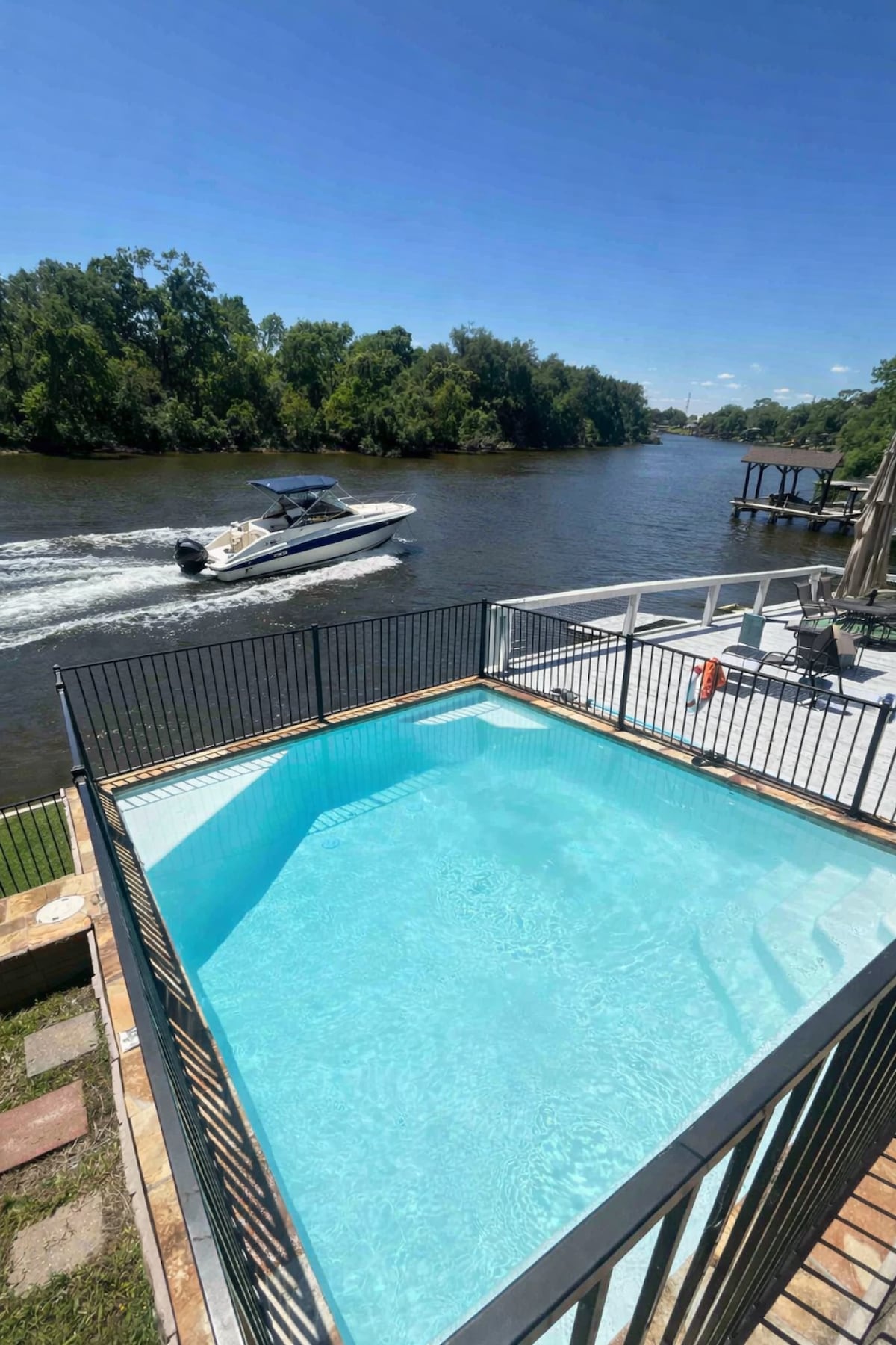 Welkom bij je privé-uitje aan de San Bernard River — een verwarmd zwembad, een enorme kamer van 9 meter, uitzicht op de rivier, Pac-Man-arcade en ruimte voor maximaal 15 gasten. Perfect voor familiebijeenkomsten, visreizen, vakanties en uitstapjes met meerdere gezinnen. Geniet van een oprit van meer dan 30 meter voor boten/aanhangwagens, een volledig gevulde keuken en prachtige binnen-buitenwoonkamers met uitzicht op de rivier.