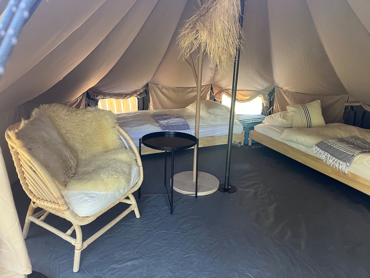 Onze glamping-tent is heel anders dan je je gewone tenten kunt voorstellen. Het biedt een ruim en mooi ingericht interieur met een diameter van 5 m, een comfortabel tweepersoonsbed, beddengoed van hoge kwaliteit en een klein koffiezetapparaat. En het allerbeste? Je geniet direct vanuit bed van het uitzicht op het meer! Stel je voor dat je wakker wordt met de zachte geluiden van de natuur op de achtergrond en de dag begint met een kopje koffie op je eigen terras, op slechts een paar meter afstand van het Bodenmeer.