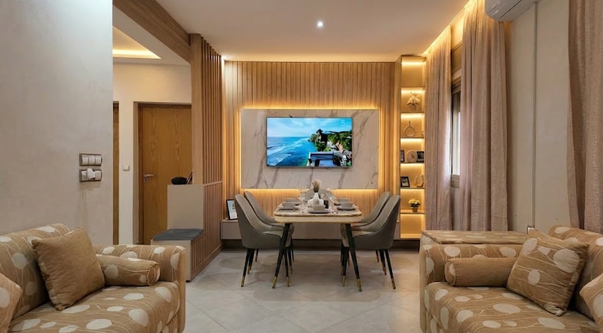 Welcome to our brand new two-bedroom apartment located in a prime area of Tangiers. This upscale property is situated in one of the most sought-after areas in the city with 24-H concierge & is only a 10 min walk from the Train Station, City Centre Mall, Ibn Battuta Mall and beaches. It offers both convenience and luxury at your doorstep. Private parking available. The apartment boasts: fibre optic WiFi, an option for chauffeur and a Moroccan breakfast prepared by our governess (additional cost)