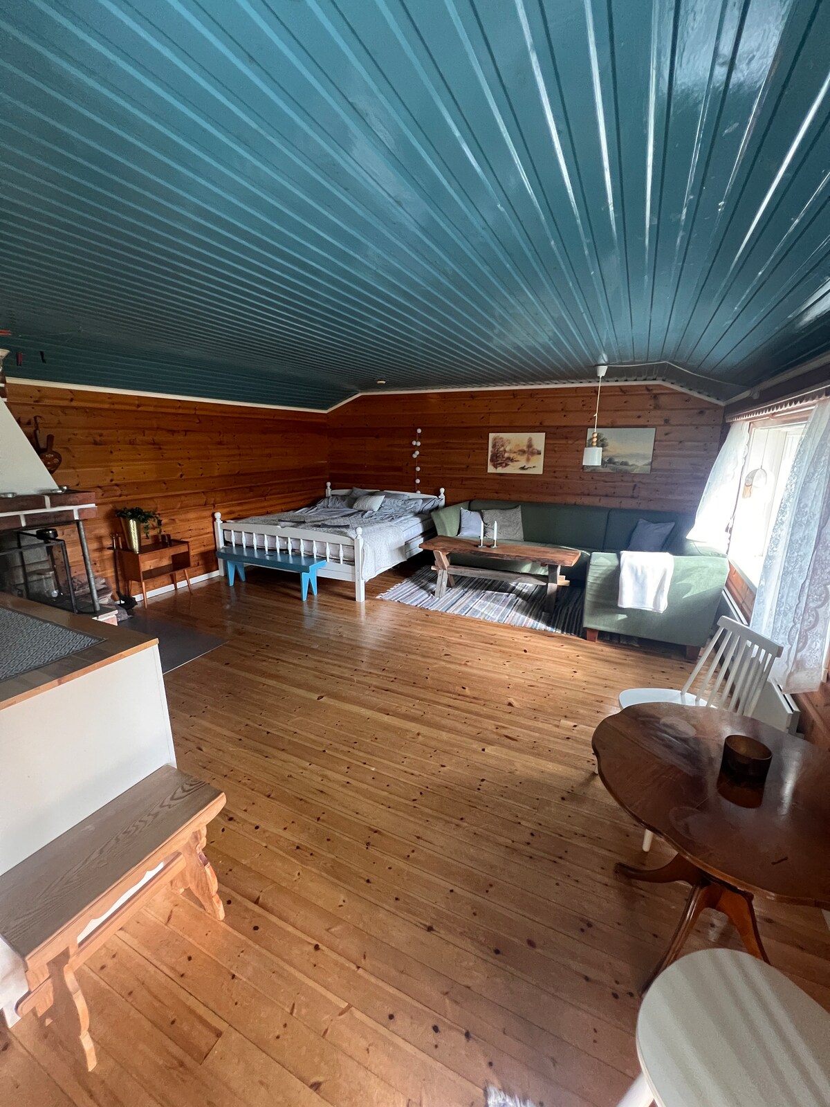 Mysig timmerstuga vid vattnet