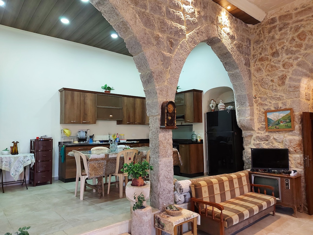 Charmant stenen huis met boog met uitzicht op de bergen en buitenruimte Ervaar een uniek en rustig uitje in ons stenen huis met 2 slaapkamers. Historische charme combineren met moderne gemakken. De woning beschikt over een ruim terras, een mooie tuin met uitzicht op de bergen en gezellige binnenruimtes. Geniet van twee ruime woonruimtes, twee slaapkamers, een eetkamer, een moderne badkamer en parkeergelegenheid. Gelegen op slechts 20 minuten van Jbeil en 7 minuten van Laklouk, is het de perfecte ontsnapping voor ontspanning en verkenning.