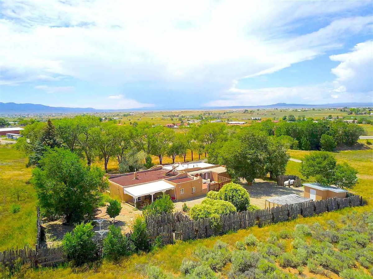 Hola, en welkom in onze Hacienda Bed & Breakfast - gebouwd in 1950 met authentieke Pueblo Revival-architectuur, intentie en geest. Zittend op 5 hectare aan de voet van Taos Mountain geniet je van een prachtig uitzicht, glorieuze wandelingen op mesa paden, een charmante/ruime volledig ingerichte gastensuite, veel gemeenschappelijke ruimtes, volledig warm ontbijt, andere fijne eetgelegenheden. Op slechts 5 mijl van het stadscentrum en op 20 minuten van de Ski Valley, heb je alles wat Taos te bieden heeft. Doe mee! Vraag naar onze aanbiedingen