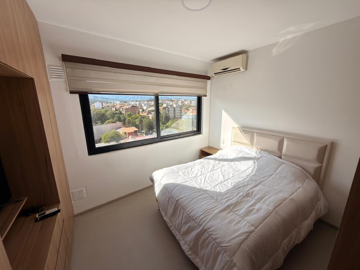 Afdeling Nieuw 1 slaapkamer met queensize bed en slaapbank in de woonkamer (aparte omgevingen) • snelle wifi •Liften • Eigen balkon met uitzicht op Tarija •Tv •Amoblado, heeft servies en kookgerei voor 4 personen. •Handdoeken en beddengoed •Zwembad in gedeelde ruimtes •Jacuzzi in gedeelde ruimtes •Grillero in gedeelde ruimtes •sauna in gedeelde ruimtes • Beveiliging van het gebouw •Gemakkelijk toegang tot het openbaar vervoer •Restaurants, cafés en banken in de omgeving