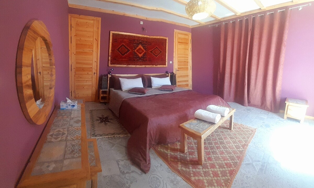 Bienvenue à Dar Bikouch, maison d’hôtes située à Assfalou, un village paisible à 3 km d’Aït Ben Haddou. Loin du stress de la kasbah, profitez de 4 chambres confortables avec salle de bain privée, climatisation, Wi‑Fi et terrasse avec vue. Petit-déjeuner marocain inclus dans le prix. Idéal pour couples, familles ou groupes en quête de calme et d’authenticité dans le sud marocain.