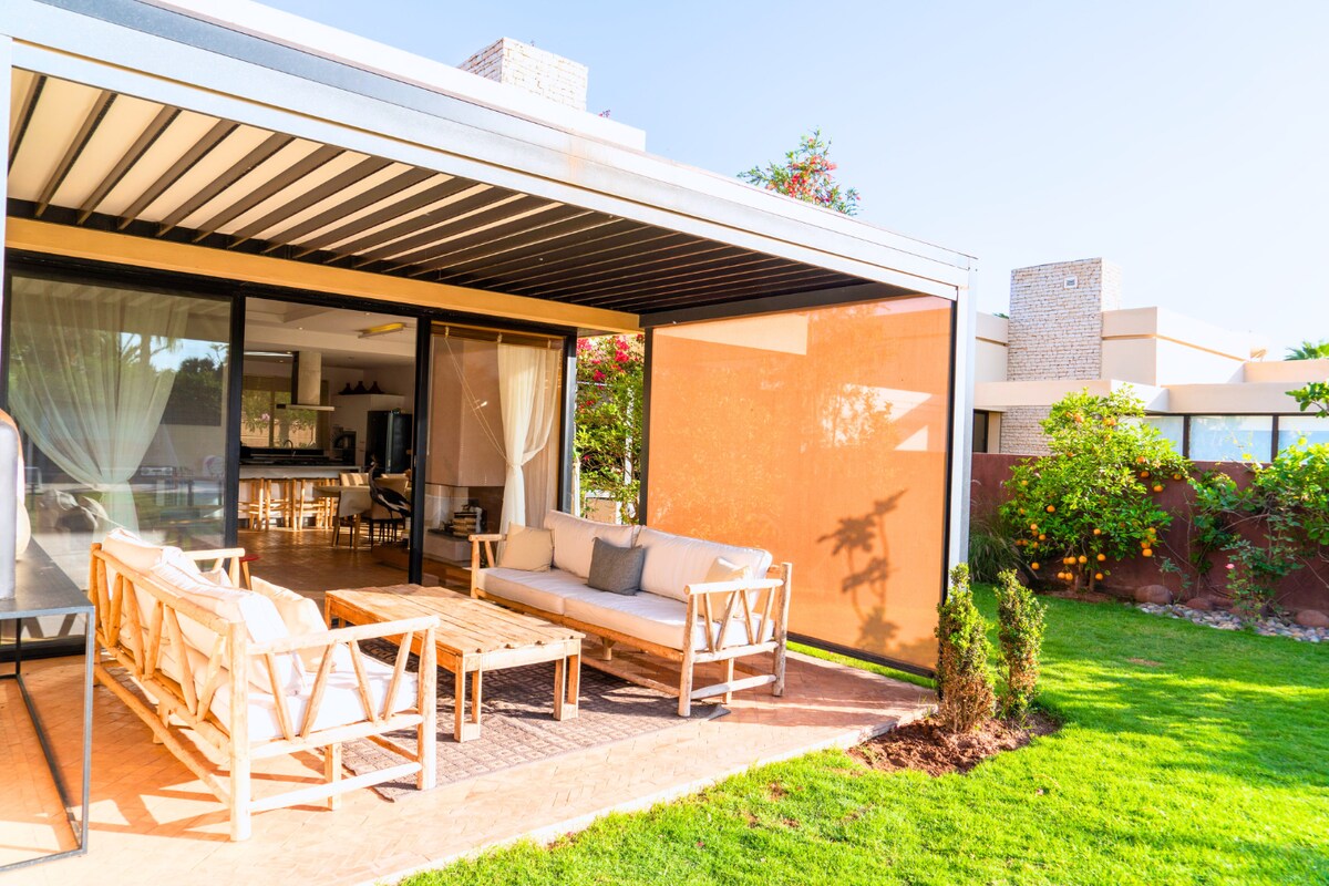 Dit rustige huis biedt een ontspannen verblijf voor het hele gezin Privézwembad zonder uitzicht , omgeven door een prachtige groene ruimte, tuin 350 m2 gekleed in Palmier en sinaasappelbomen Gelegen op 30 minuten van Agadir In een zeer rustige en veilige omgeving 24 uur per dag met een Golfette-service voor je reizen op het landgoed Gratis eigen parkeerplaats Golfbaan , tennisbaan en een fitnessruimte beschikbaar Een zeer groot gemeenschappelijk zwembad ook beschikbaar op het landgoed