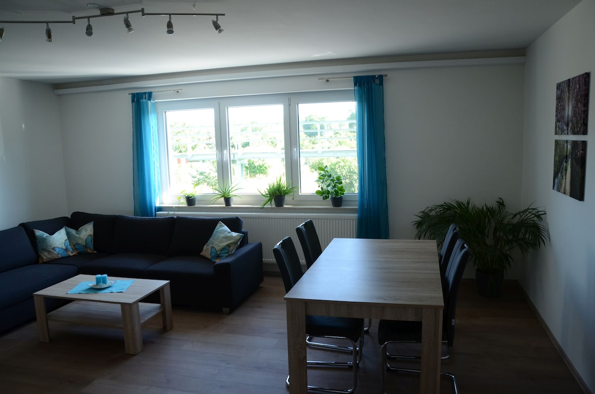 Core gerenoveerd appartement (45m²) voor 1-4 personen. 35m² dakterras met uitzicht op de vallei van Spessart, Odenwald en Engelbergklooster. Slaapkamer met tweepersoonsbed, woonkamer met slaapbank en smart-tv, volledig uitgeruste keuken, ruime badkamer met regendouche, wasmachine, droger, tuin met barbecue, kinderbedje, kinderstoel, gratis wifi en parkeergelegenheid.
