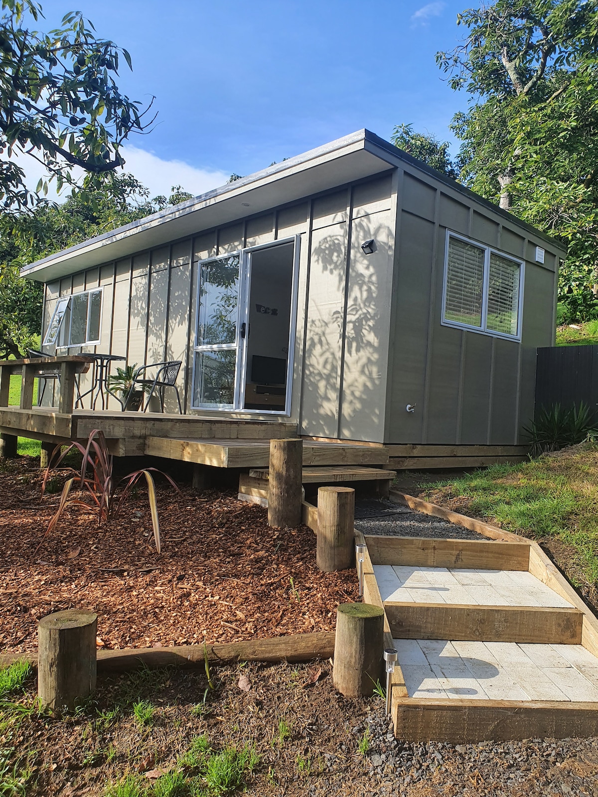 Welkom bij Nava Deena: je romantische retraite in het hart van Tauranga! **Niet geschikt voor kinderen onder de 13 jaar** Ontdek Nava Deena, een echt prachtig designhuis met één slaapkamer gelegen op een serene hectare grond midden in het centrum van Tauranga. Onze accommodatie is een uniek toevluchtsoord dat de rust van het landelijke uitzicht combineert met het gemak van het stadsleven. Stel je voor dat je wakker wordt met het uitzicht op schapen die grazen in onze rustige vallei en geniet van de avondzon vanuit je eigen bubbelbad.