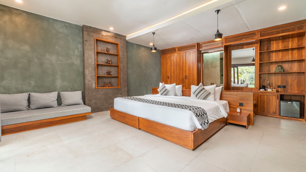 De grote binnen- / buitenvilla met grote glazen schuifdeuren vanuit de woonkamer en de slaapkamers, kijkt uit over het zwembad en de groene junglevallei eronder. > 60sq/m Deluxe Slaapkamer > 2 Gasten > 1 kingsize bed > 1 badkamer > Wifi - 100 Mbps (Biznet) > Woonkamer binnen met een grote bank > Buitendagbed op ongeveer 11 m > Grote moderne keuken > Koelkast > 5-pits gasfornuis & oven > Eigen badkamer met douche en groot bad > Airco en plafondventilator in kamers > USB- en INTERNATIONALE STOPCONTACTEN