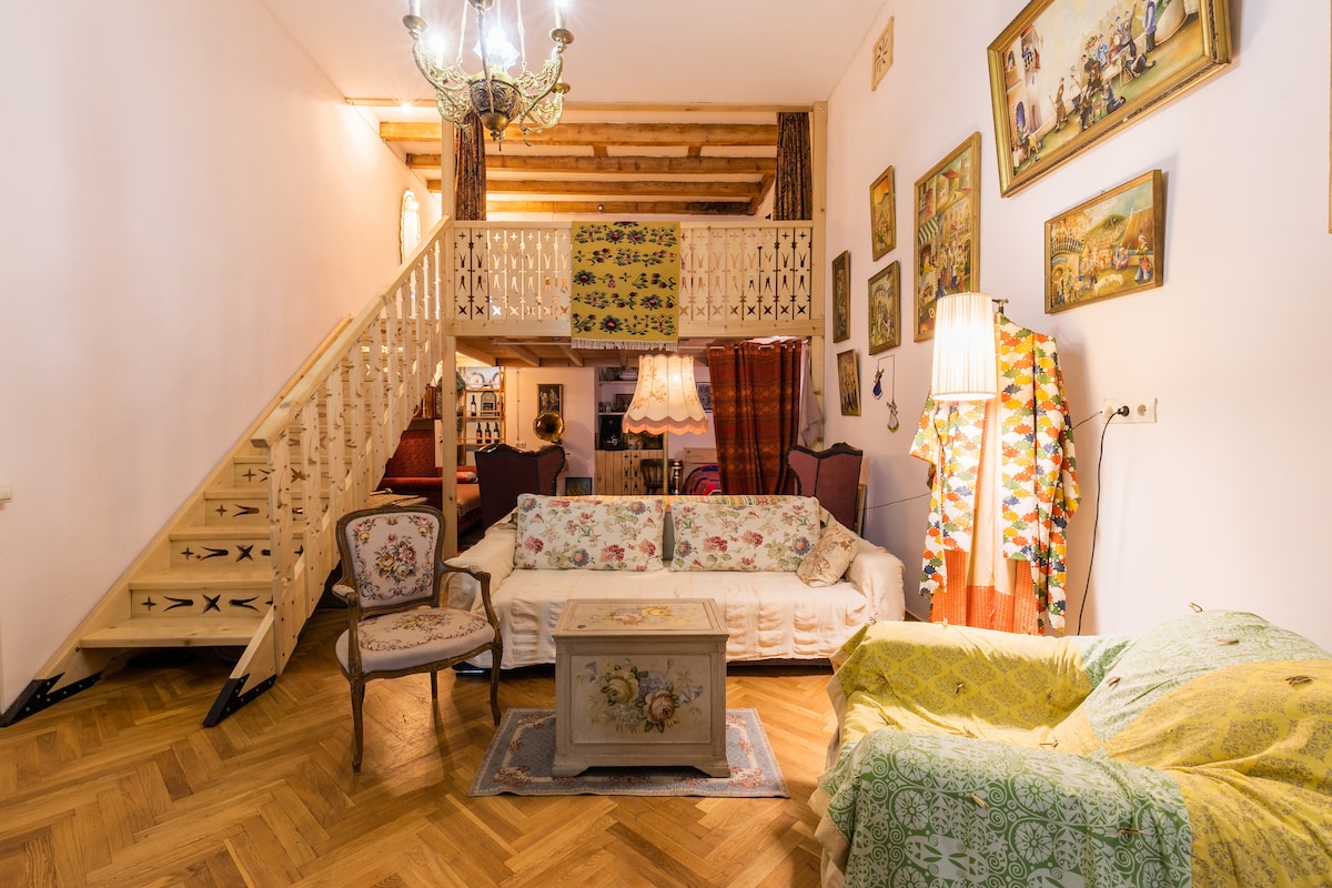 Ons appartement is gelegen in het centrum van het historische deel van Tbilisi. We zijn op de eerste verdieping van de beroemde Georgische schilders, Elene Akhvlediani museum. Het interieur van het huis is in een authentieke Georgische stijl, in navolging van de stappen van onze voorouder, die ook schilder was.In een pergola buiten kun je relaxen en proeven van onze familie gemaakte wijn uit onze eco schone wijngaarden. Welkom bij Tbilisi lieve toerist, met onze armen wijd open - welkom bij ons huis en wees onze gast!