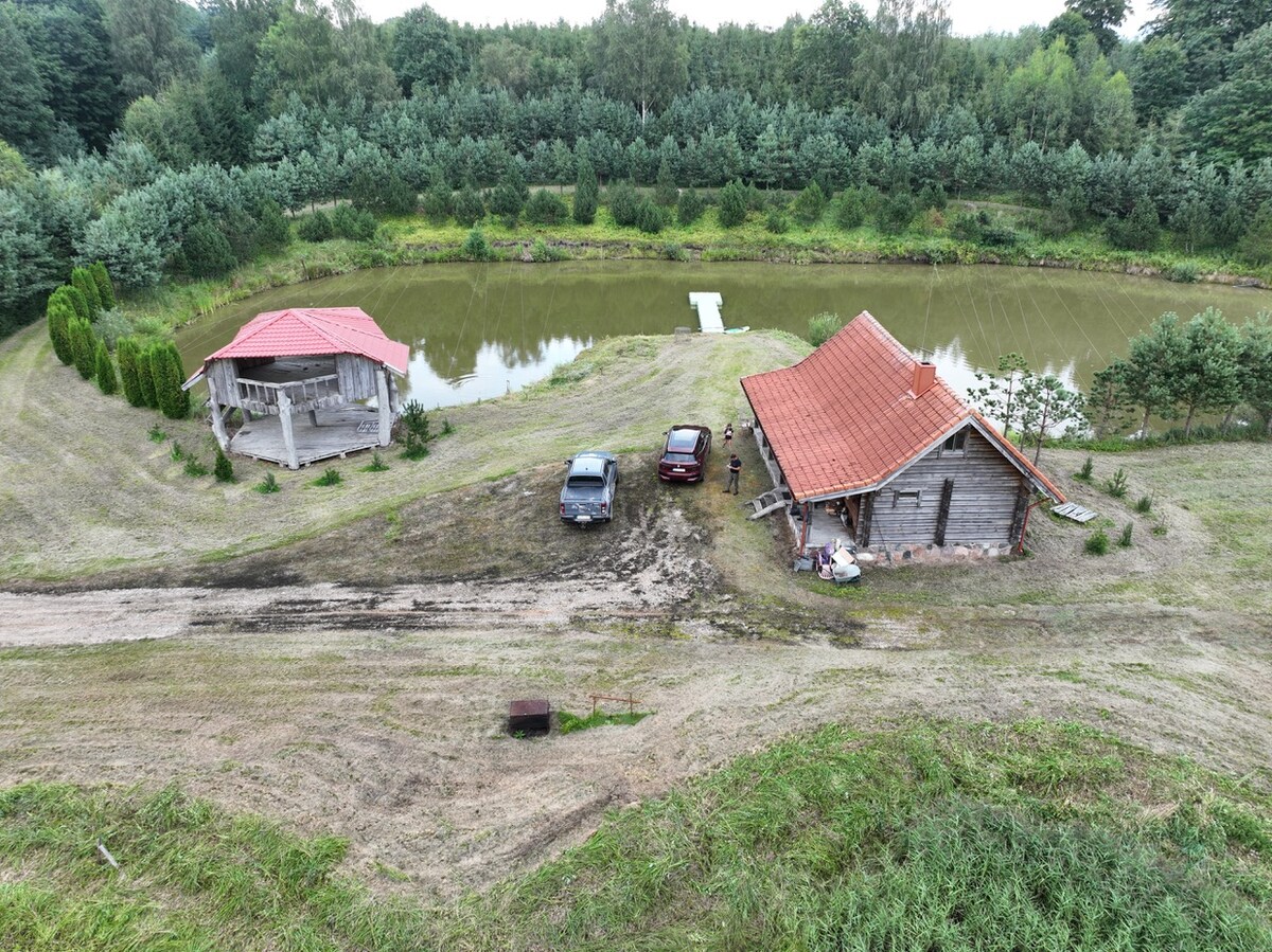 Relax with the whole family at this peaceful place to stay. Unique place to stay for fishing, swimming and relaxing. our log, rustic lodge is perfect for nature lovers who appreciate peace and harmony. First floor - sauna, mini kitchen, living room. Outdoor terrace with glace walls for dinning with lake view. Barbeque zone with Komado. Second floor - one bedroom 1 double, 2 single beds, second bedroom double bed. Plus roof terrace with outdoor furniture and stunning view. Enjoy it!