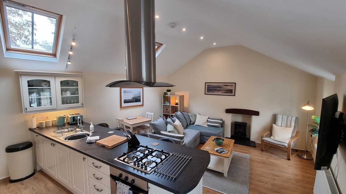 Charmant Grade 2 vermeld Coach House. Afgesloten binnenplaats met zitplaatsen. Stabiele deur naar de begane grond met badkamer en open woonkamer/eetkamer en keuken. Grote eettafel, 2 tweezits leren banken en houtkachel. Badkamer bestaat uit toilet, wastafel en douche over een gerenoveerd bad met rolblad. Past mogelijk niet bij een persoon van ongeveer 6 voet. Rustieke houten vloeren overal. Bed 1 heeft een kingsize bed, ingebouwde kasten en een roestvrijstalen dubbelwandige rookgasafvoer. Bed 2 heeft alleen twee eenpersoonsbedden.