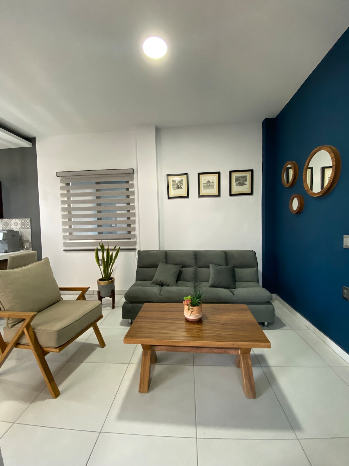 Modern loft-appartement in Mexicaanse stijl, volledig ingericht, met airconditioning, 1 tweepersoonsbed, woonkamer met slaapbank, kast, volledige badkamer, volledige keuken, eetkamer, smart-tv, internet in het appartement en in gemeenschappelijke ruimtes, wasmachine en droger voor gemeenschappelijk gebruik, groene gebieden, huisservice van restaurants in de omgeving en uitstekende locatie binnen Plaza Luna Lima.