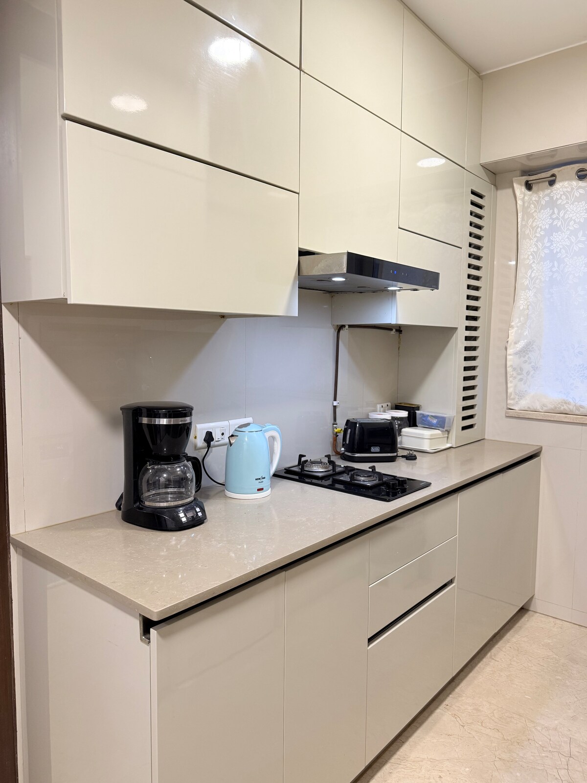 Een eigen 1BHK appartement in Medina Heights op de 3e verdieping, gelegen op een steenworp afstand van Carter Road promenade. Professioneel beheerd, zeer privé en ideaal voor gasten die meer waarde hechten aan locatie, privacy en comfort dan aan diensten in hotelstijl. Eén appartement per verdieping, op loopafstand van de Carter Road-promenade — met gratis wasfaciliteiten twee keer per week. Belangrijk: op 100 voet lopen van de hoofdweg, geen toegang voor voertuigen.