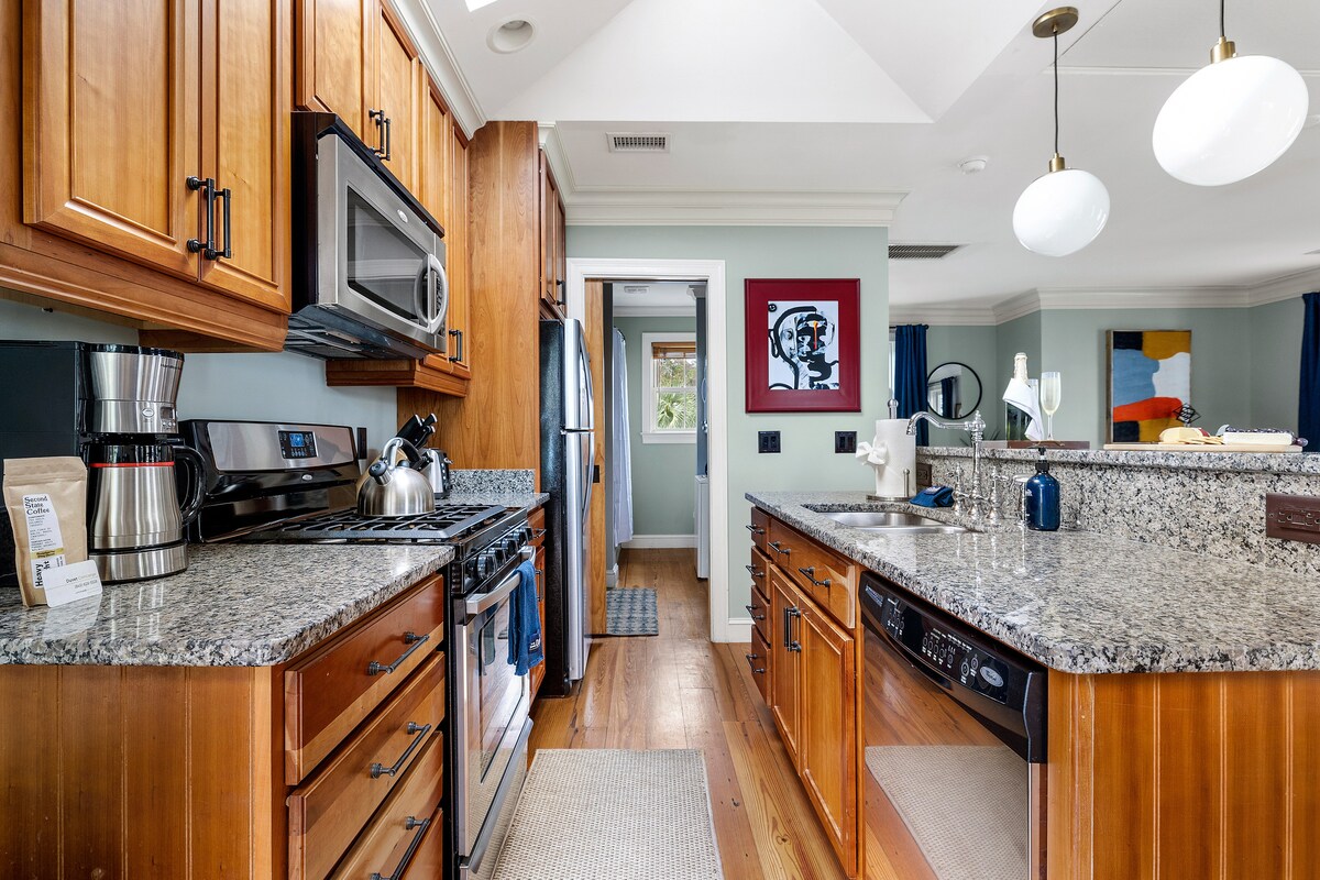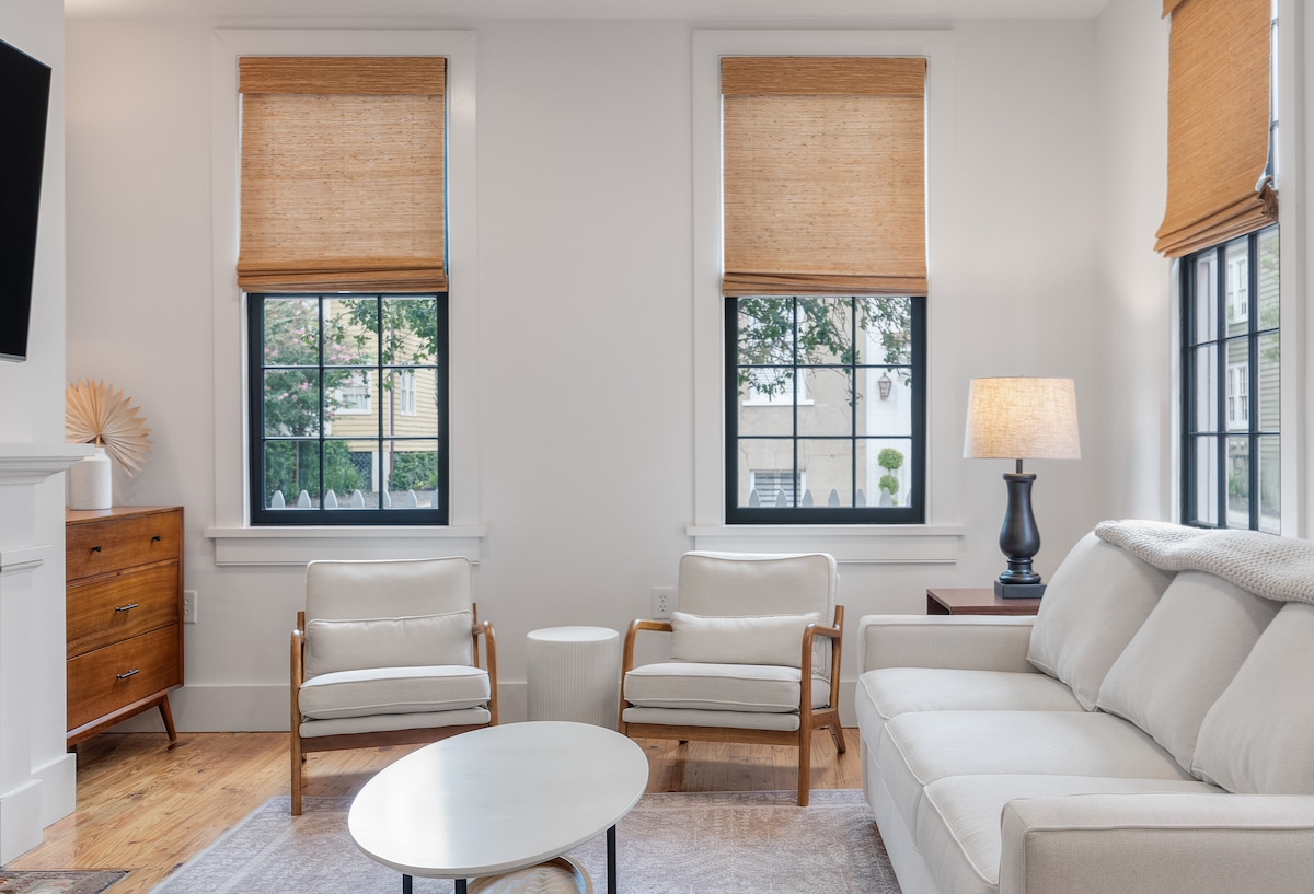 Eersteklas Airbnb met 2 slaapkamers in het historische centrum, op steenworp afstand van KING St. Nieuw gerenoveerd met ultrasnelle wifi en werkruimtes. Gratis parkeergelegenheid voor twee auto's. Ervaar het bruisende nachtleven van Charleston en de beste restaurants in de HOT Upper King St-omgeving, op slechts een minuut lopen. Opmerking: geluidsisolatie helpt, maar lichte slapers kunnen in het weekend lawaai opmerken. Ideaal om het leven in het centrum te ervaren. Let op dat er momenteel bouwwerkzaamheden aan de King St-zijde zijn, die nu binnen zijn, dus minder lawaai nu. Licentie: OP2018-00153.