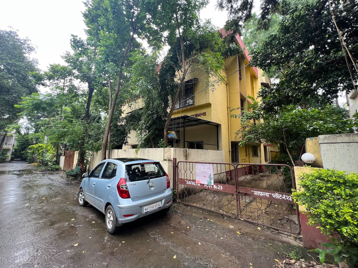 De plek is ruim, luchtig en kan worden genoten door een familie/vrienden. De keuken is volledig uitgerust. De hal kan beddengoed voor een kind hebben. Een extra slaapkamer tegen een nominale vergoeding met een tweepersoonsbed kan beschikbaar zijn voor gasten die meer dan 2 personen zijn! Het bevindt zich op de eerste verdieping, ongeveer 200 meter van het metrostation Nalstop en op slechts 2 km van Iyengar yoga Instt, FTTI, Deccan & Kothrud! Alle prominente restaurants, gerenommeerde ziekenhuizen en klinieken, bezienswaardigheden zijn in de buurt!