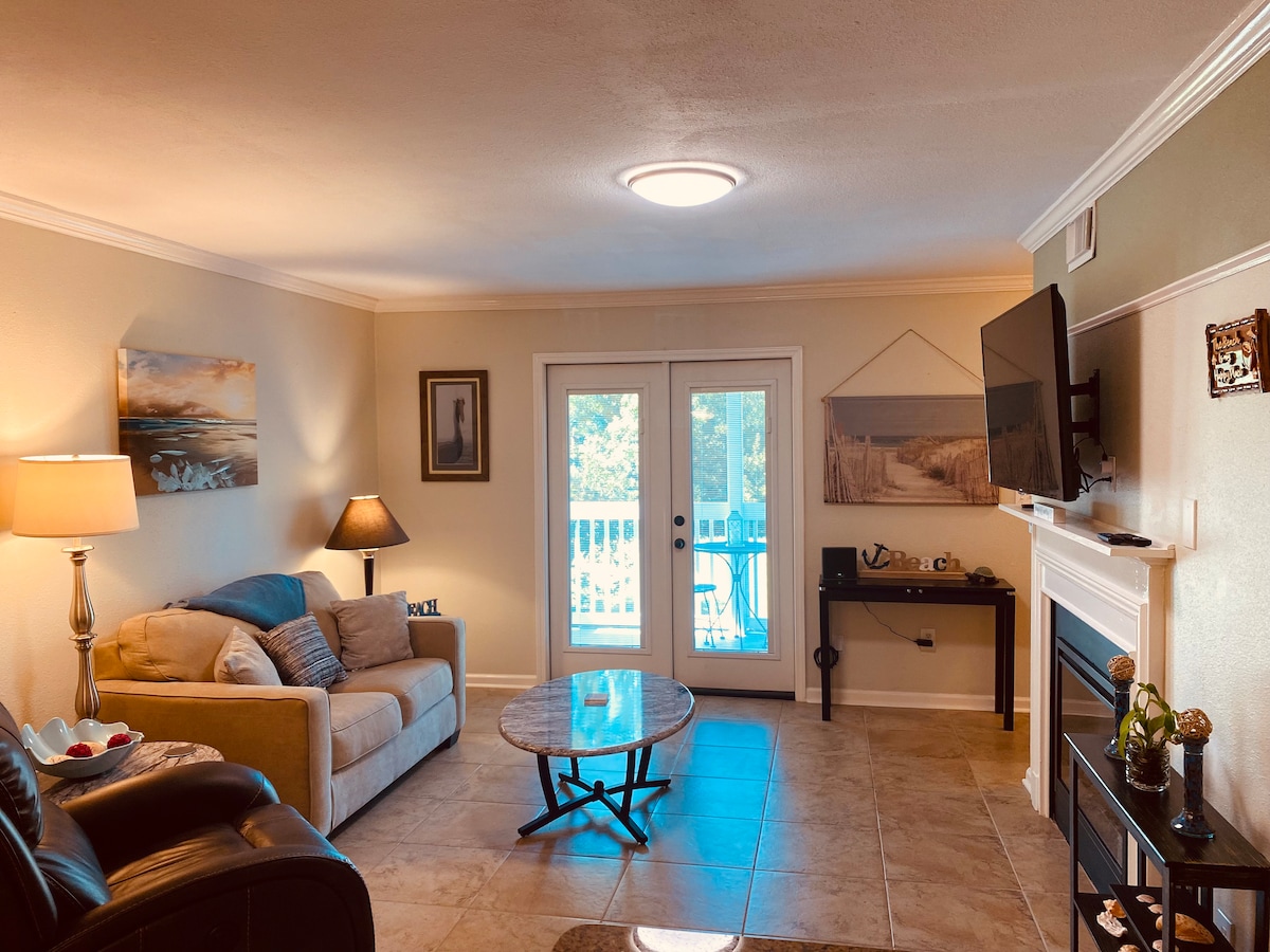 Bijgewerkte luxe hoek 1 bed/1 bad aan het water! Tegelvloeren door, eigen slaapkamer met kingsize bed, stapelbed (twee eenpersoonsbedden klein )in de gang, queensize slaapbank. Volledig gevulde keuken met gloednieuwe apparaten. Overdekt balkon aan het water met grill! 3,50 mijl van het strand! Dineren op het terrein, nachtleven, bioscoop, jachthaven met charterboten/cruises, Arcade, reuzenrad, winkelen, het Wharf Ampitheater, het Oasis-resortzwembad met golfslagbad,lazy river, glijbanen,bubbelbad plus seizoensgebonden bar/restaurant bij het zwembad!