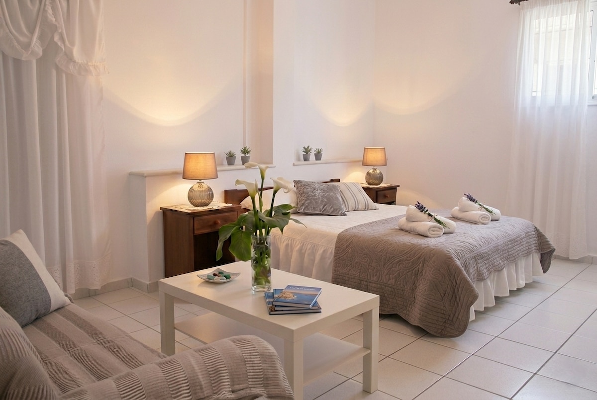 A quiet complex of studios ideally for relaxed holidays. **IMPORTANT NOTICES** -We will need your passport number or ID number in order to accept your reservation. -The property is far from everything. -There is no public transportation. -There is nothing to do around the area. -There are no grocery stores near the village. -We advise you NOT to book if you are not willing to rent a vehicle because the private transfer and taxis cost 50€ per ride.