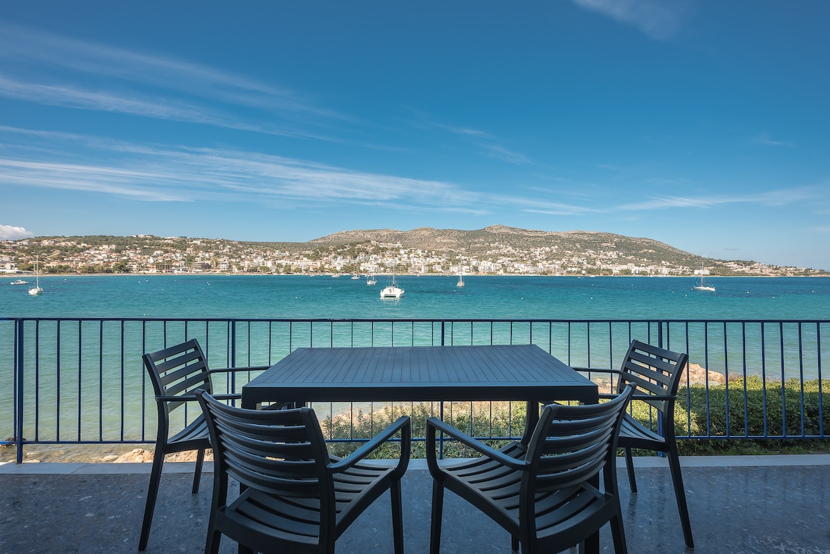 Our newly renovated holiday 45m2 apartment is stylish, minimal yet cozy to make you feel right at home. A haven of white and palest grey, the apartment is filled with natural light throughout the day. Our private 100m2 terrace will give you all the serenity and tranquility you need when on vacation by enjoying the stunning view of Vouliagmeni's Bay. Close to beaches, ski school, tennis court, basketball court, hotels, restaurants, forest, parks, 30' from Athens Centre, 30' from Athens Airport.