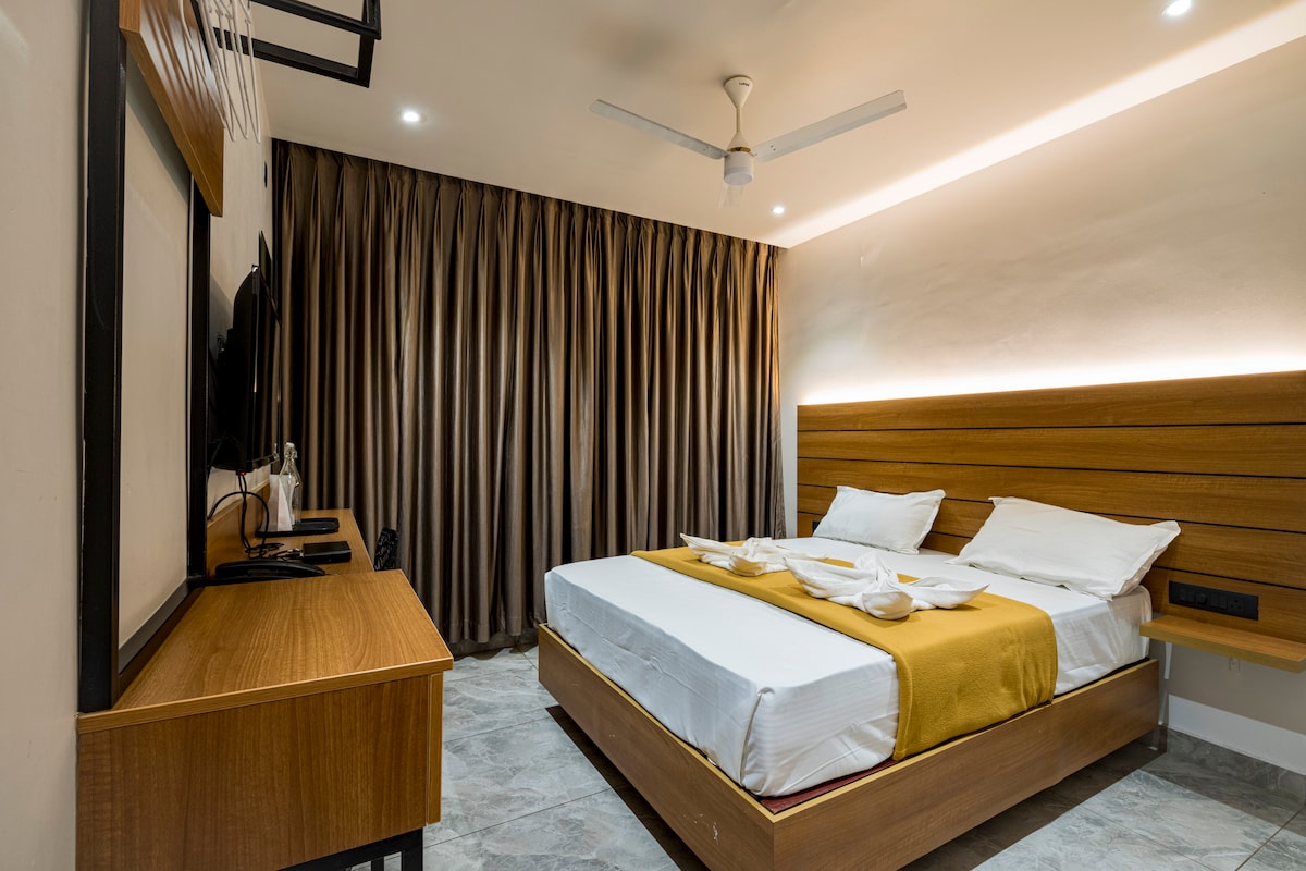 The Room at Uphills Boutique Hotel offers comfort and space for a relaxing stay. It includes a closet, chair, telephone, charging points, work desk, TV, and fan. The bathroom features a shaving mirror, premium toiletries, hot & cold water, and soft towels. Guests also enjoy daily newspapers and a homely atmosphere, making it ideal for family getaways or longer vacations with beautiful surroundings.