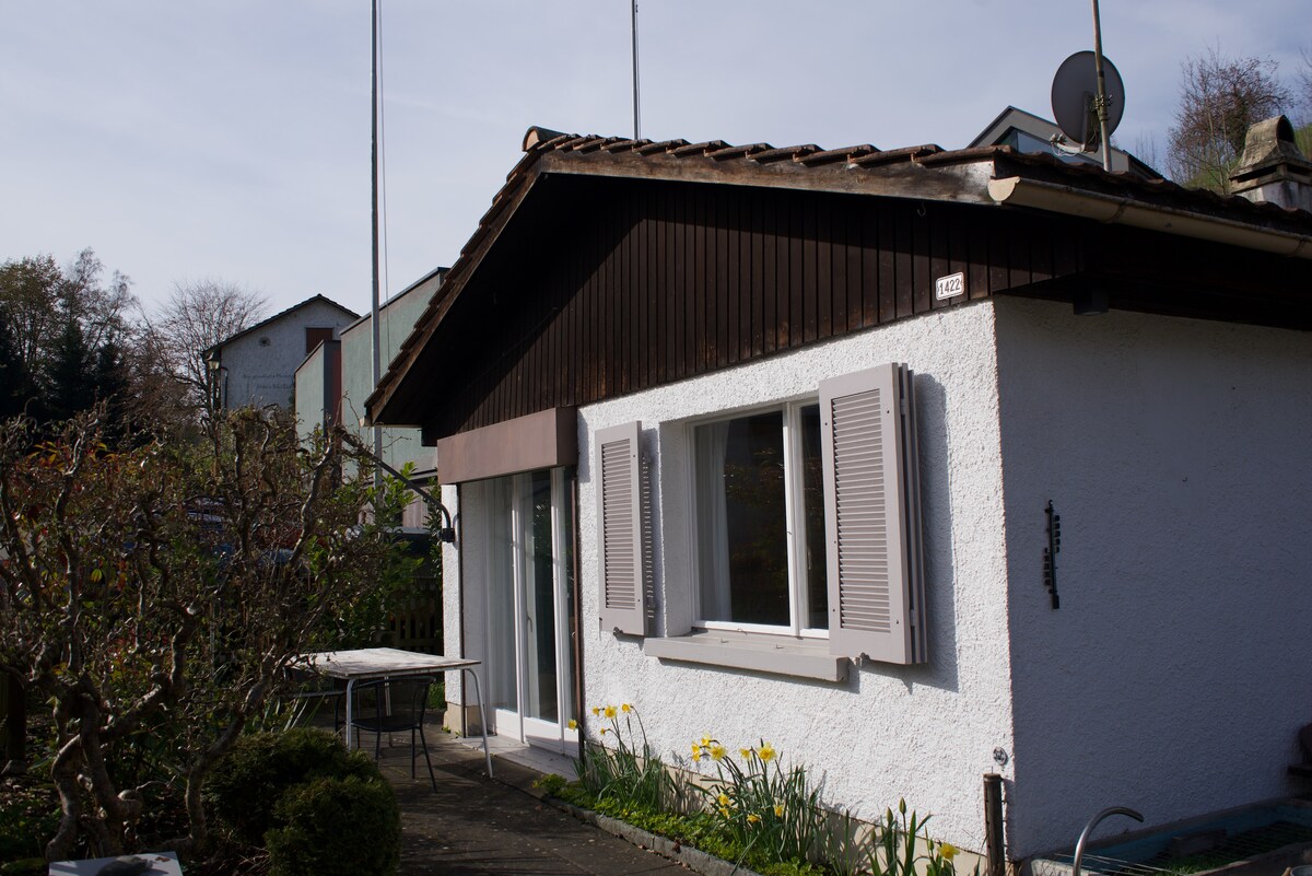 Vrijstaand houten huis met grote overdekte veranda ( noordkant). Pure natuur. Volledig ingericht om te wonen. De bedden zijn neergezet. Wij doen de eindschoonmaak voor je. Er zijn geen verdere kosten. Gratis parkeren voor het huisje. Gratis draadloos down 32.0/ tot 35 1 hond tot 25 kg Volgende Bischofszeller Rosenwoche van SA. 20/06/26 naar SUN.28.6.26 De keuken-woonkamer bevindt zich op de begane grond. Evenals toilet en douche. De slaapkamer is via de trap op de bovenverdieping.