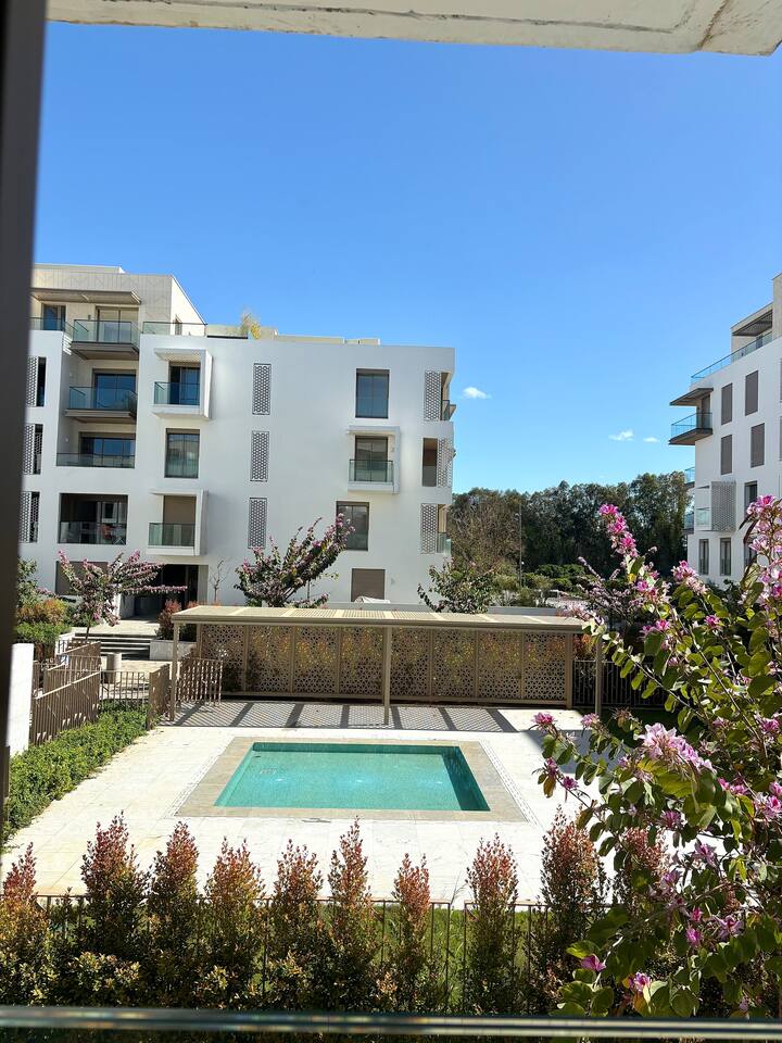 Experience elegance in Rabat in this high-end apartment, located in one of the city’s most exclusive neighborhoods. Secure residence with a premium pool and gym. Refined interior, cozy bedroom, bright living room, modern kitchen, fast Wi-Fi, and air conditioning. A luxury retreat for an unforgettable stay, combining ultimate comfort and a prime location.