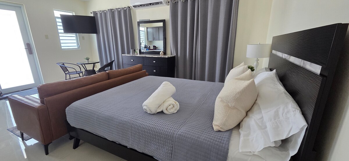 Een luxe verblijf in een nieuwe, moderne, schone kamer, hotelstijl. De perfecte plek om te verblijven en te genieten van de prachtige stranden van Manatí en de noordkant van Puerto Rico. De kamer heeft een keuken met een koelkast, magnetron, elektrische koekenpan, koffiezetapparaat, klein elektrisch fornuis en kookbenodigdheden. Queensize bed, smart-tv, kleine eettafel voor twee, een bank, haardroger, wifi, kast en badkamer.