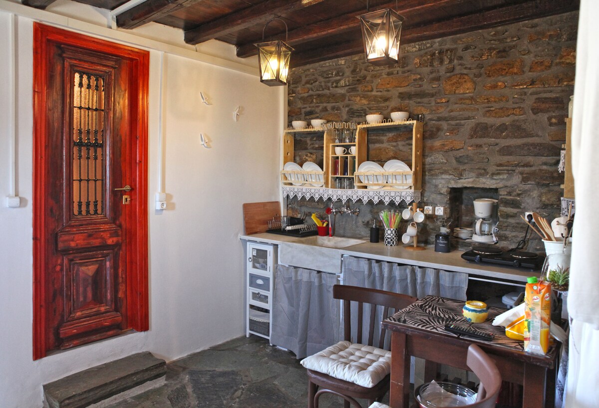 Een stenen gastenverblijf van 20 m2 op de locatie Deli, op de heuvel van Resurrection. Uitzicht op de omliggende eilanden (Tinos, Mykonos, Paros) en de haven Ermoupoli. Het heeft een bank - bed; voor koeling heeft het een plafondventilator en airconditioning. De keuken is voorzien van een koelkast, fornuis en oven om te koken, filterkoffiezetapparaat, broodrooster en alle benodigde keukengerei. Het heeft wifi en televisie. Ideaal om te genieten van de zonsopgang en de avondmaan.
