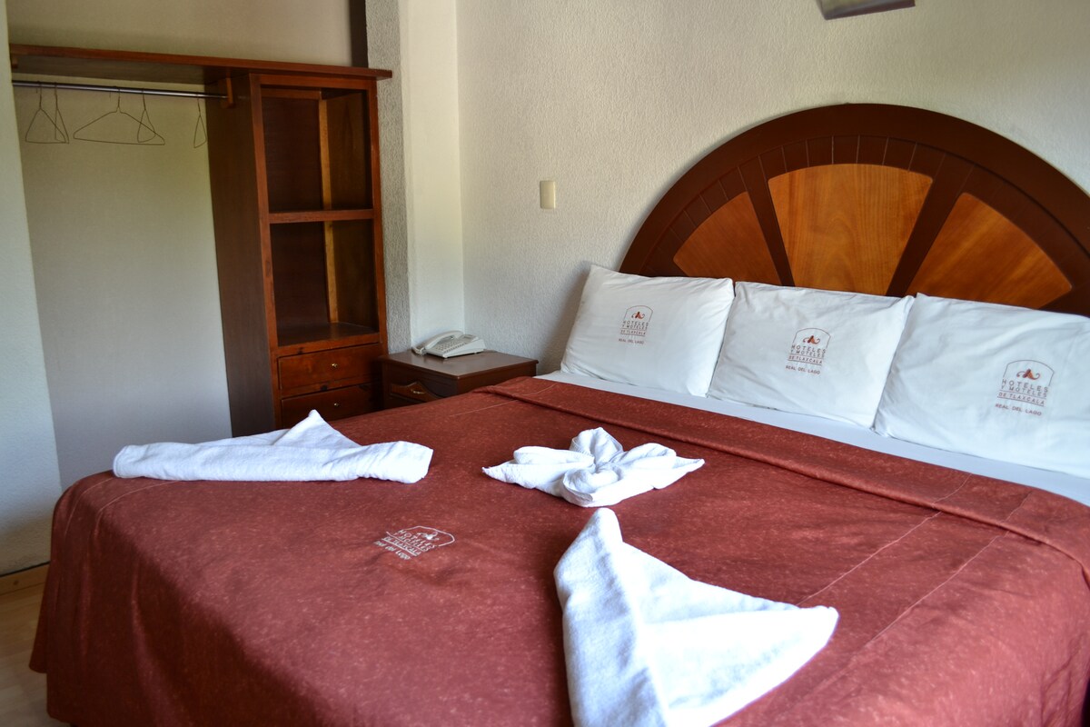 Gezellige standaardkamer met een kingsize bed, ideaal voor koppels of reizigers die op zoek zijn naar comfort in het hart van Tlaxcala. Het combineert een warme inrichting met traditionele en moderne accenten, een eigen badkamer, wifi, kabel-tv, een bureau en essentiële voorzieningen. Inclusief extra items op aanvraag, zoals een strijkijzer, droger, ventilator of elektrische verwarming. Op een paar stappen van het centrale plein, restaurants en historische bezienswaardigheden.