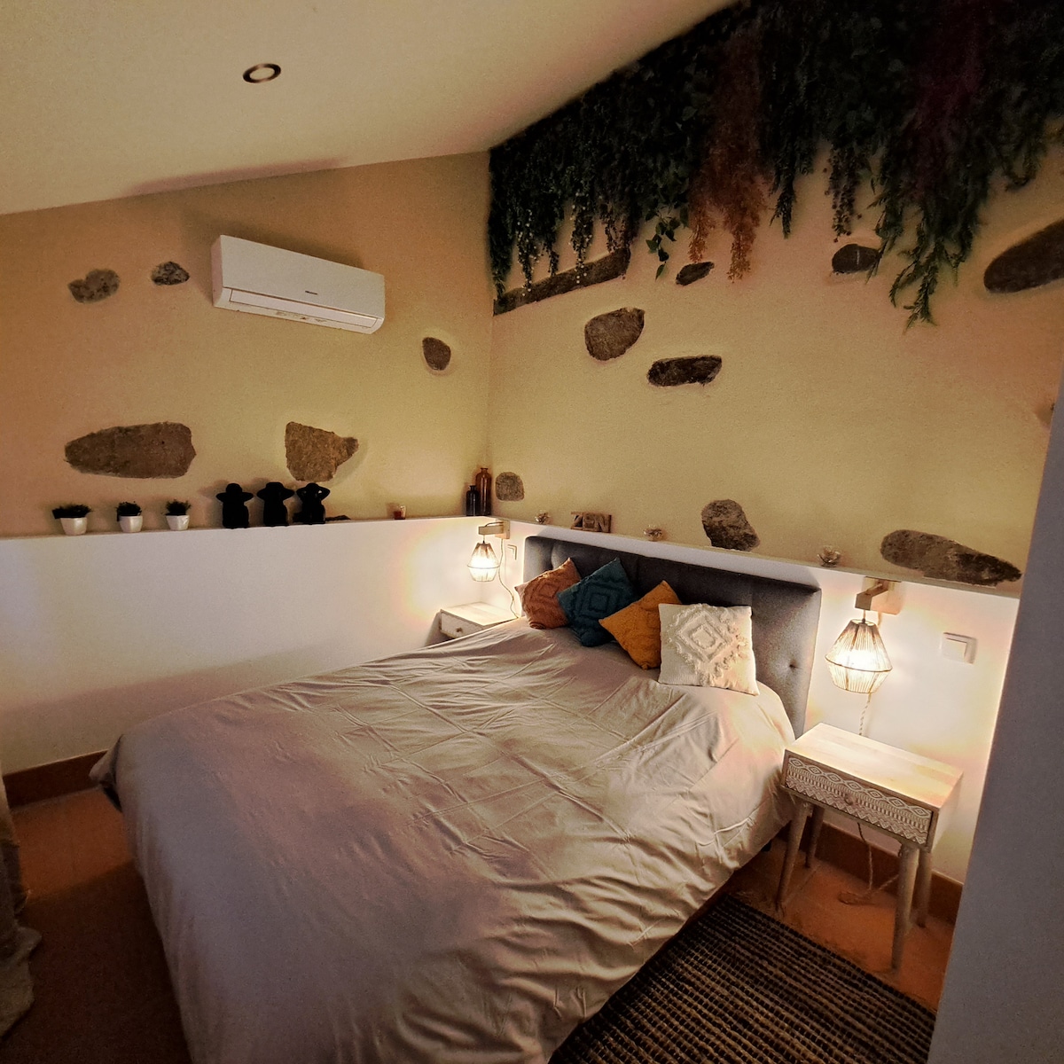 Rustiek huis met 2 tweepersoonsslaapkamers en de mogelijkheid van 2 eenpersoonsbedden op de bovenverdieping (extra kosten per persoon, indien nodig). De slaapverdieping heeft een gastenbadkamer (geen douche). Volledig uitgeruste keuken (zonder vaatwasser of wasmachine) en een complete badkamer met douche op de begane grond. Gezellige zithoek. Buiten, een tank van 3x2m voor volwassenen en een prachtig uitzicht op de Açude da Laranjeira. Slechts 6 minuten van een minimarkt en café. Perfect om te ontspannen in het hartje van de natuur.