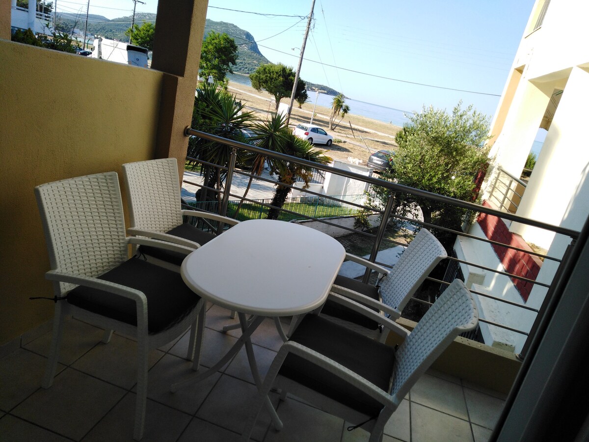 Τα διαμερίσματα είναι καινούργια, πρώτα στη θάλασσα, φωτεινά, με μεγάλα μπαλκόνια όπου υπάρχει τραπεζαρία, δωμάτιο με διπλό κρεβάτι και άνετο στρώμα, το δεύτερο δωμάτιο έχει κουζίνα, μεγάλο ψυγείο μεγάλη ντουλάπα τηλεόραση και άνετο καναπέ-διπλό κρεβάτι και θέα την θάλασσα και πολύ πράσινο. The flat is brand new, at the sea front, spacious, lot of sunlight, with big balcony and table set and chairs. It has a large double bedroom, and second double bedroom with kitchenette, TV, and sea view.