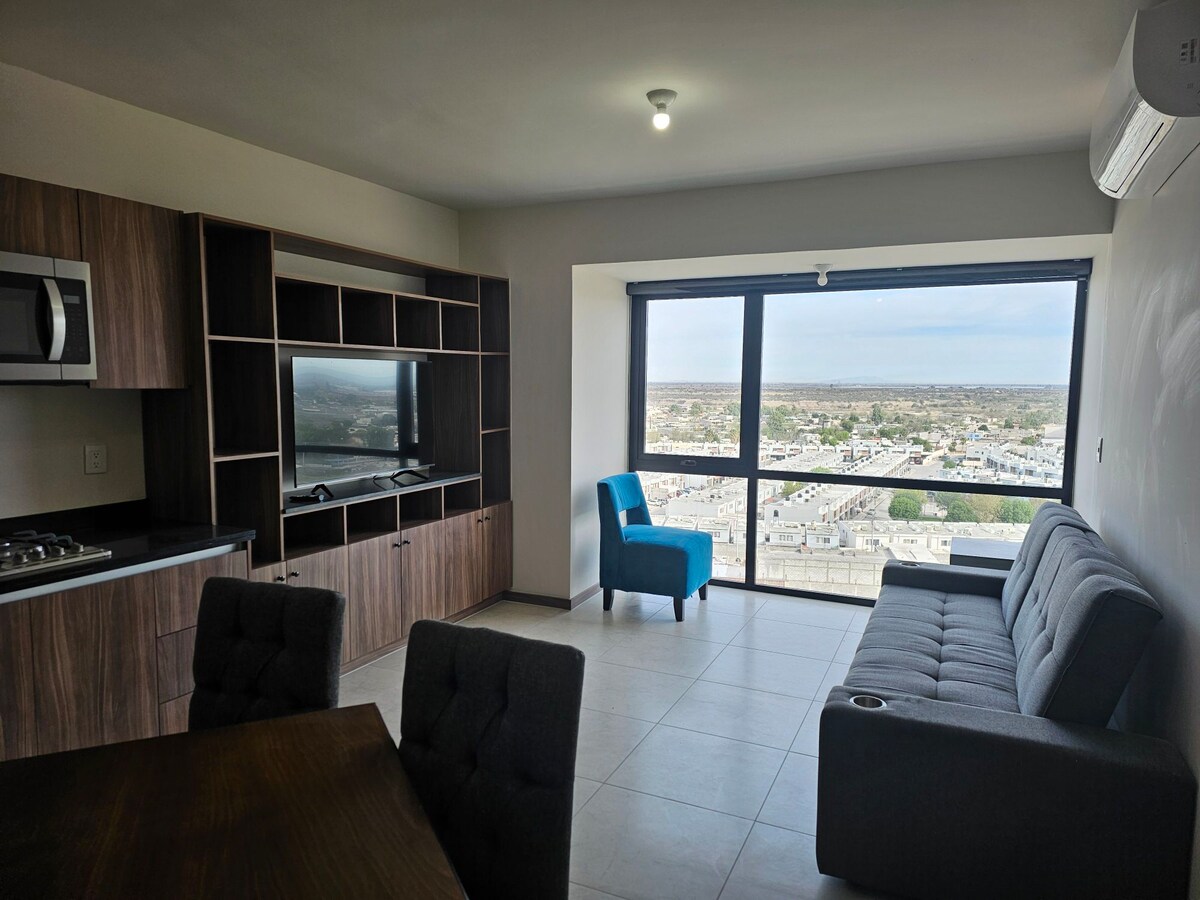 Departamento nuevo en una de las zonas de más alta afluencia. Con excelente ubicación , a unos pasos del Mall Galerias, a 5 minutos del aeropuerto. El edificio cuenta con amenidades como alberca, área gourmet, cine, ludoteca, área común, lobby con rampa de accesibilidad, elevadores, estacionamiento con seguridad. A pocos pasos de cafeterías, bancos, restaurantes, gimnasios y tiendas para disfrutar.