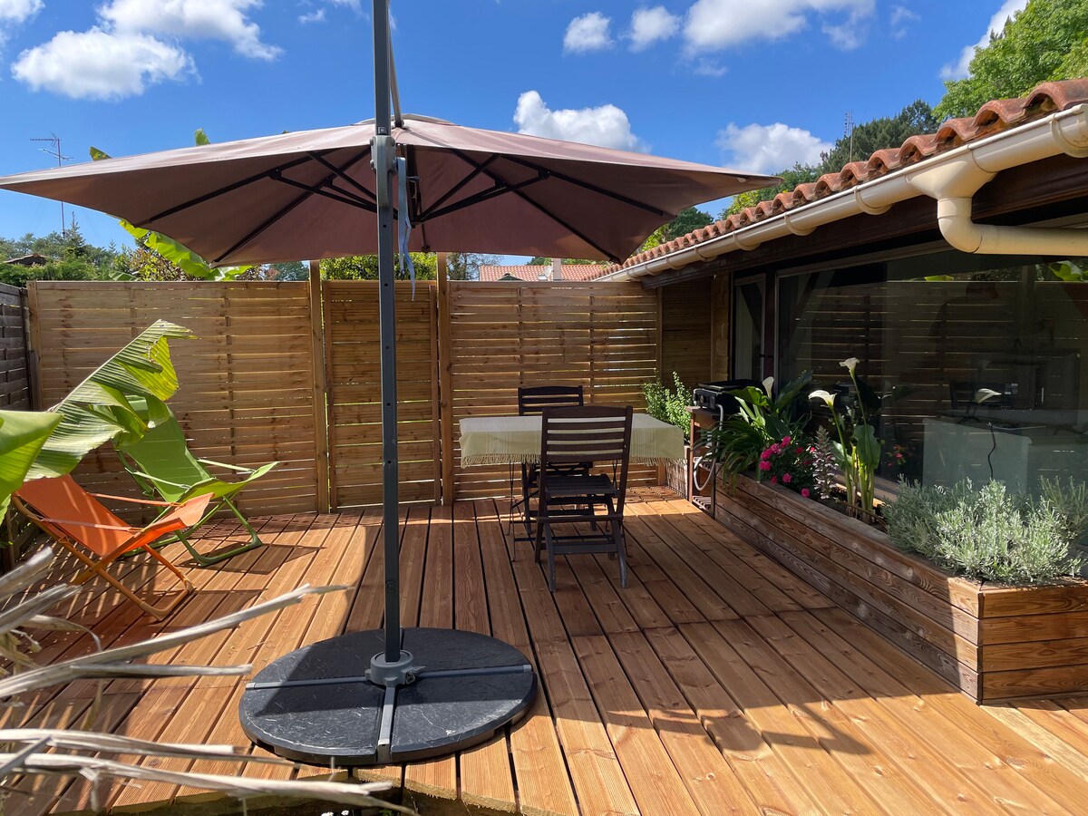 Onafhankelijke studio met eigen zuidelijke tuin, zodat je van 's ochtends tot s avonds zon hebt☀️. Geniet van de buitenkant met een houten terras met plancha ruimte waar je kunt lunchen in de schaduw van een paraplu of kunt genieten van de ligstoelen😎. Het heeft een uitgeruste keuken en een badkamer met toilet. Charmant dorp, winkels en lokale markt. Slechts 10 km van de belangrijkste stranden van Seignosse, Hossegor... Veel fietspaden die helemaal naar het strand gaan en het bos oversteken.