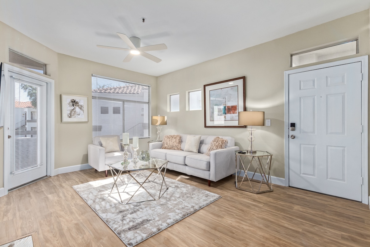 ✨ Dagen in de woestijn, nachten in resortstijl ✨ Ontspan in een stijlvol appartement met 2 slaapkamers, gelegen in een omheinde wijk in North Scottsdale – op slechts 5 minuten van Kierland Commons en Scottsdale Quarter. WAAROM JE HET GEWELDIG ZULT VINDEN • Primaire suite met kingsize bed + gastenkamer met queensize bed + queensize slaapbank • Verwarmd zwembad met bubbelbad, ligstoelen en barbecues op slechts een steenworp afstand • Privébalkon voor koffie in de ochtend of cocktails bij zonsondergang • Snelle wifi en 3 smart-tv's met volledig Fubo-pakket • Garage voor 2 auto's en sleutelloze toegang voor gemakkelijke toegang