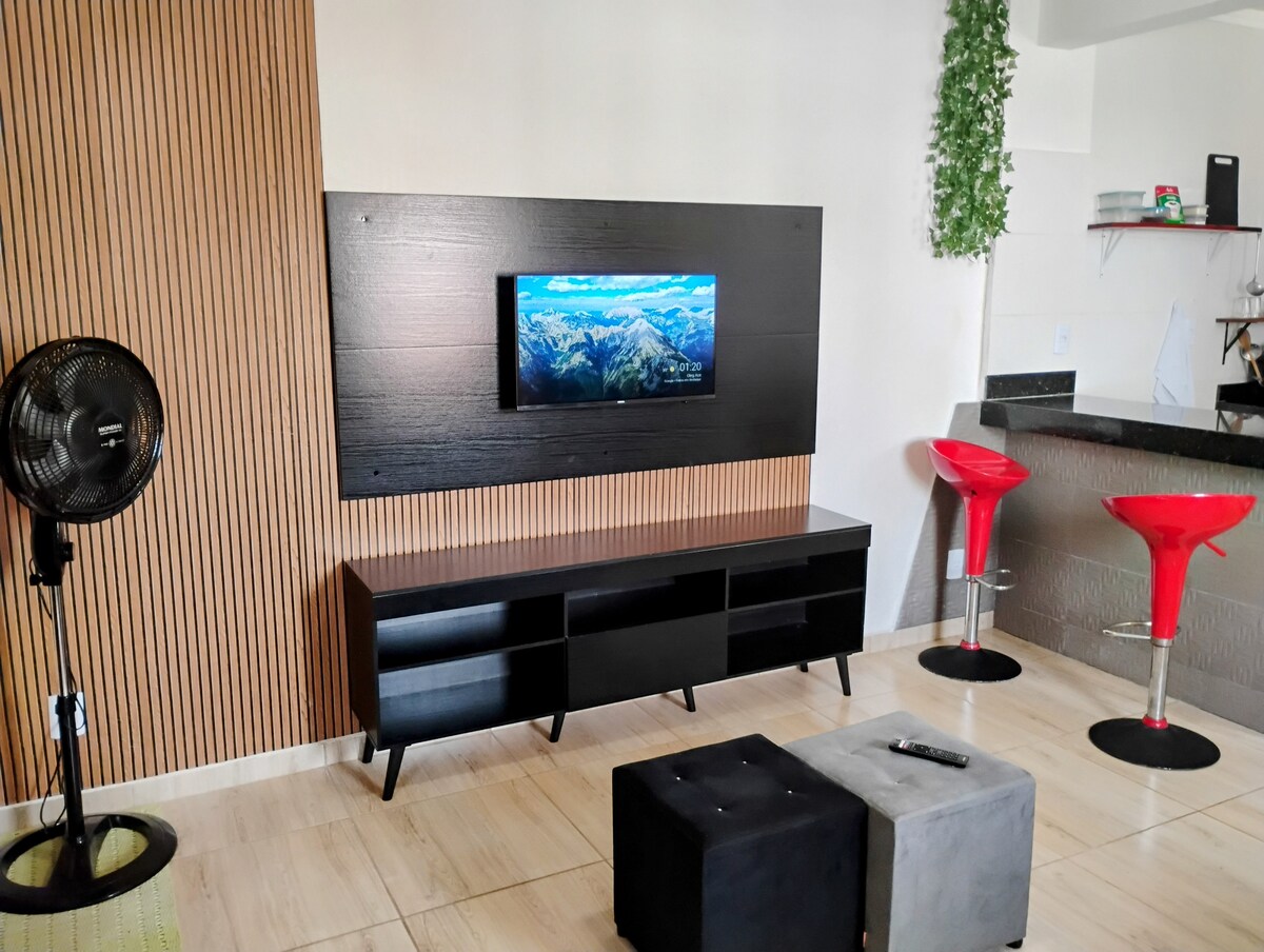 Studio Londen – Zwembad, 300 Mb wifi en garage. Nieuwe studio van 32 m², modern en gezellig, met warm/koud airconditioning en standaard hoteluitrusting. Keuken voorzien van inductiekookplaat, magnetron, minibar, Dolce Gusto koffiezetapparaat en zuiveraar. 50 inch smart-tv, snelle wifi en balkon. Gelegen in de toplocatie van Três Corações, op slechts 4 km van de snelweg Fernão Dias.