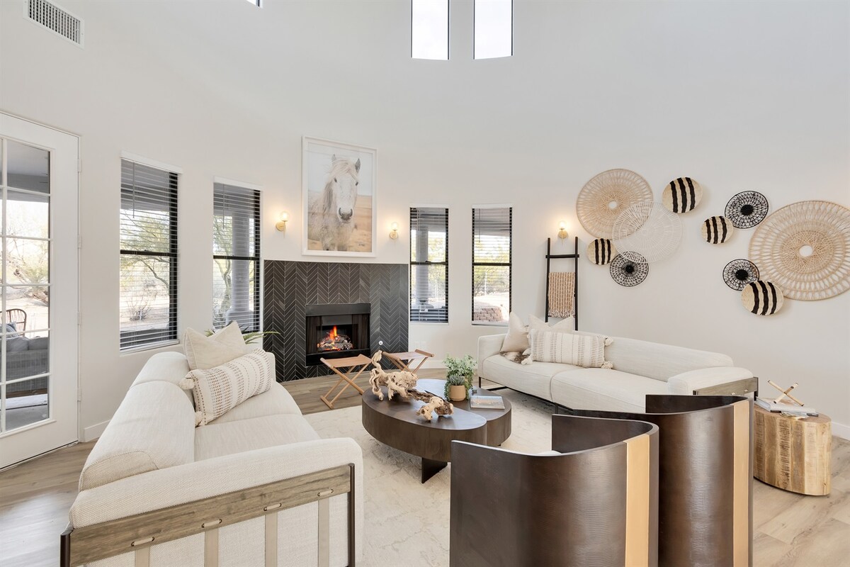 ** Prime North Scottsdale, maar buiten de drukte van de stad. Mooie gerenoveerde woning op groot terrein in het prachtige North Scottsdale. 3 grote slaapkamers (alle kingsize bedden - plus beschikbare twee eenpersoonsbedden). Queensize slaapbank. Twee pickleballbanen* (alleen overdag spelen). Werkruimte met extra monitoren. De open woonkamer is gecentreerd rond een grote bar/zithoek/e-fireplace. Omheinde binnenplaats met open haard, tuinmeubilair, thuisfitnessruimte* en bubbelbad*. *=Vrijwaringsverklaring vereist. Geen feesten/harde geluiden. Huisdieren toegestaan (tegen betaling).