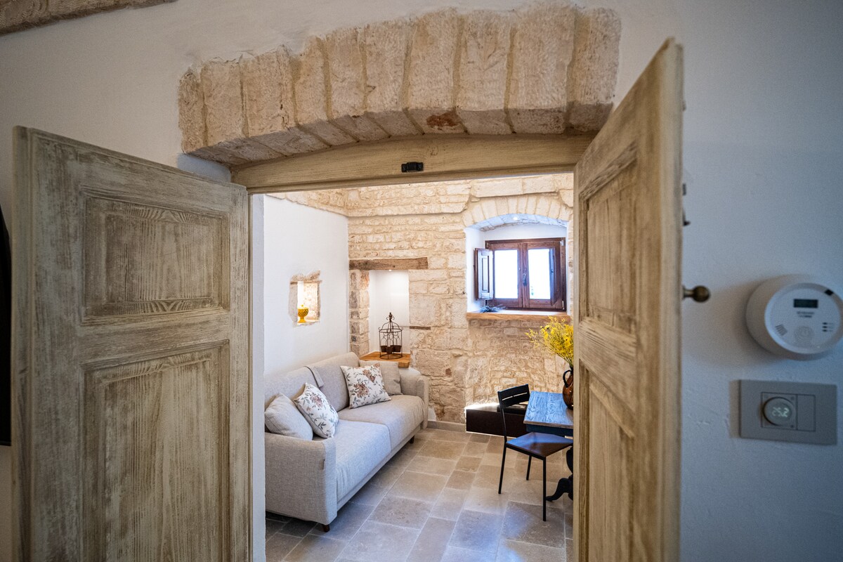 La casa è un trullo del 1800, tutto ristrutturato, dotato di riscaldamento ed aria condizionata, Smart TV e WI-FI. La camera da letto è dotata di un letto matrimoniale con comodini, lampade da lettura e armadio. Nella sala, dotata di frigo, forno microonde, tostapane e macchina espresso caffè, è sistemato un divano letto; è possibile cucinare e pranzare su tavolo per 4 persone. Dalla sala si accede al bagno dotato di lavatrice, acqua calda, tutti i sanitari WC, lavabo, bidet, doccia con cabina.