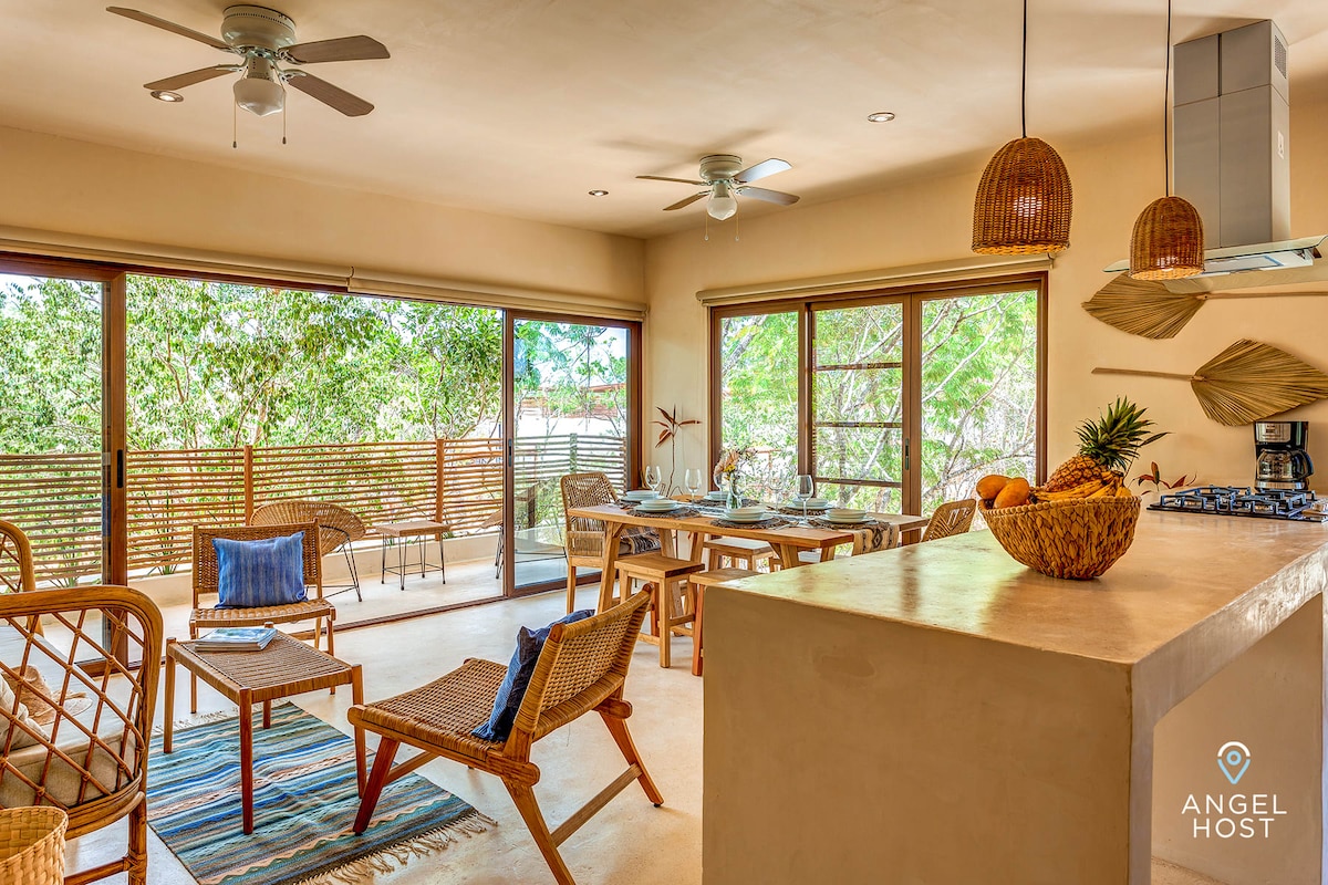 - Een rustige nieuwe ontwikkeling met weelderige jungle-omgeving en een mystieke sfeer! - Fantastische gemeenschappelijke voorzieningen - zwembaden en cenotes, co-working, fitnessruimte en yogavloft - Een dromerig, op de natuur geïnspireerd appartement met deuren naar een eigen balkon en een weelderig uitzicht. - Privé 100 m volledig uitgerust dak met eetkamer in de buitenlucht, dompelbad en grill - FiberOptische wifi, volledig uitgeruste keuken, wasmachine, droger, gratis parkeren, hondenpark