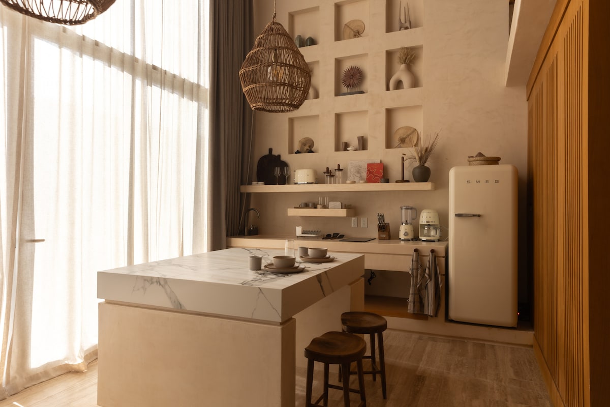 In het hart van Tulum is deze boho-suite met een eigen terras een ruimte om te ontspannen, te ademen en te genieten van het leven in een langzamer tempo. Natuurlijk licht bepaalt het ritme van de dag. Er zijn momenten om stranden en cenotes te verkennen, en andere om binnen te blijven, verder te gaan met wat je inspireert, en gewoon te genieten van de rust. Het warme en evenwichtige ontwerp creëert een intiem toevluchtsoord dat comfort en sereniteit combineert en je uitnodigt om wat langer te blijven en Tulum vanuit een ander perspectief te ervaren.