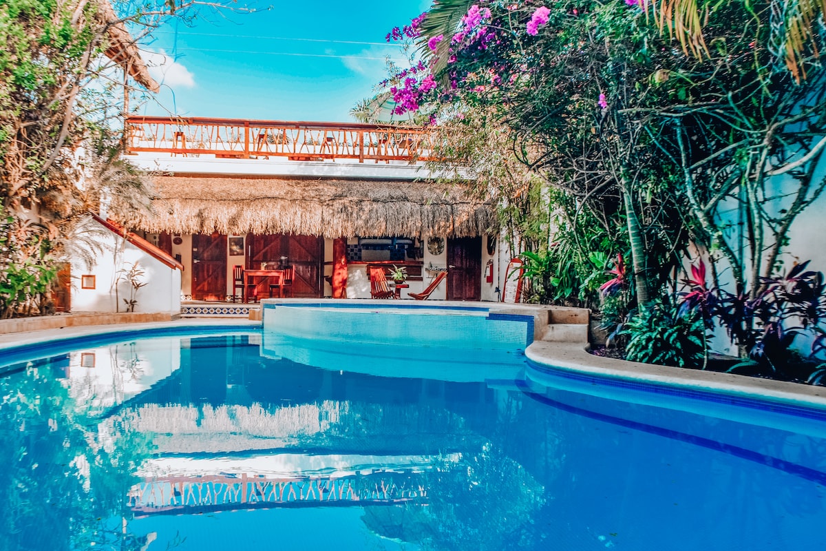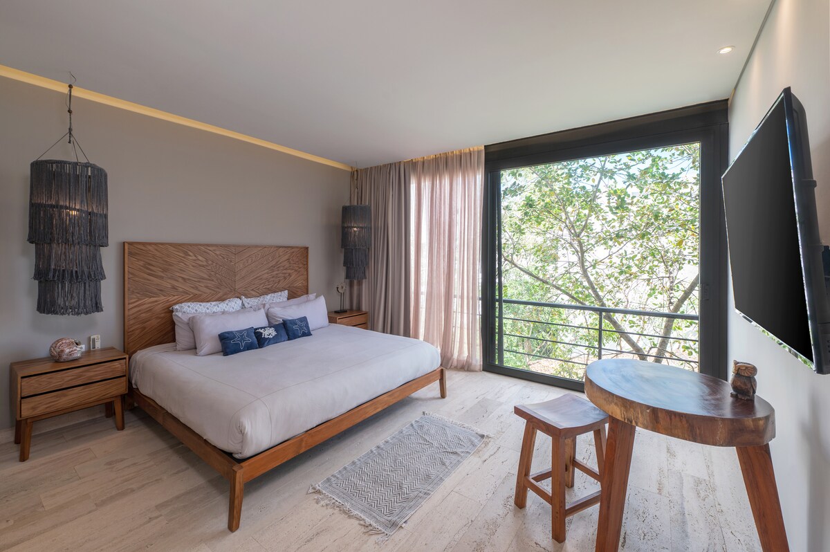 Je vakantiehuis weg van huis; ideaal voor koppels, digitale nomaden of soloreizigers. Met snel internet, slaapkamer met kingsize bed, airconditioning, kitchenette en een dompelbad op het balkon. Je kunt gebruikmaken van ongelooflijke gemeenschappelijke ruimtes zoals een zwembad op het dak, jacuzzi's en nog veel meer. Een van de meest handige locaties, je bevindt je op loopafstand van een aantal van de beste restaurants, winkels en supermarkt; en dicht bij het strand. Je hebt alles wat je nodig hebt om de Tulum-ervaring te beleven.