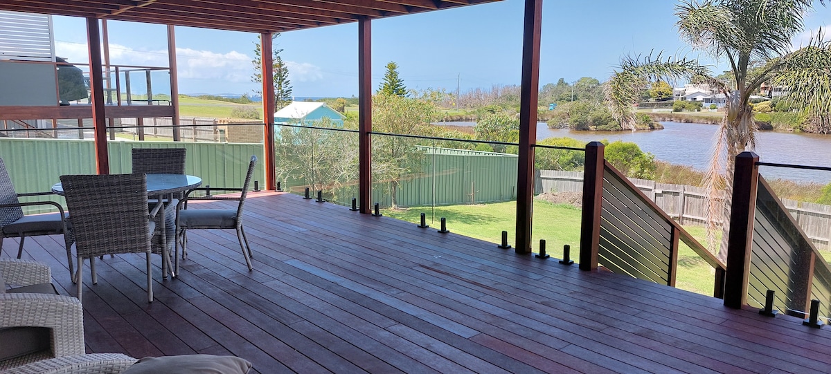 Upper Deck Beach House biedt uitzicht in alle richtingen, ruime dekken om van uw vakantie te genieten en een grote achtertuin en verwelkomt gasten in Tuross Head. Maak 5 minuten lopen tot de stranden, meer, rivier, fietspad en winkels. De informele, kuststijl van het huis heeft veel ramen om de bries en het uitzicht vast te leggen. De 4 comfortabele slaapkamers zijn geschikt voor 8 personen, met een ruime, volledig uitgeruste keuken, twee grote badkamers, beide met douches, en een wasmachine en droger. En voor je gemak hebben we wifi!