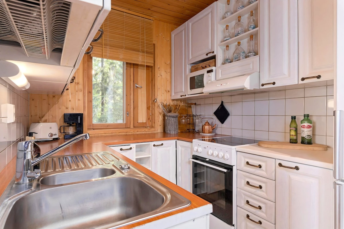 De hut ligt op 20 km van het stadscentrum van Helsinki. De bushalte naar Helsinki ligt op 500 meter van het huisje. Het ligt naast de zee en heeft een eigen aanlegsteiger van waaruit je kunt vissen of een duik in de zee kunt nemen. Er is een slaapbank, een open haard en een kleine keuken, smart tv en wifi, een houtgestookte sauna en een vide met een tweepersoonsbed. Broodrooster, koffiezetapparaat, Nespresso-apparaat, een roeiboot en magnetron is ook beschikbaar. Het huisje is 27 m ², dus het is het meest geschikt voor één of twee personen.