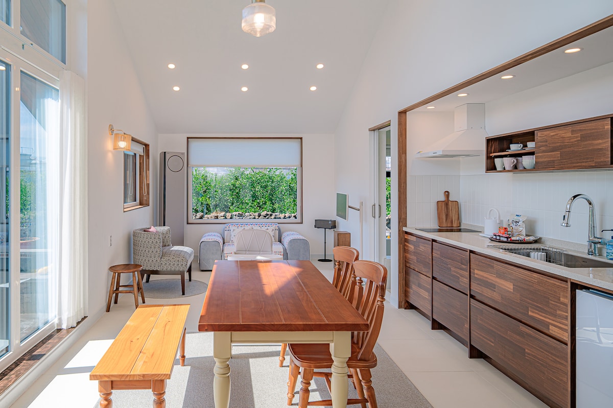 * Vereiste voor het boeken - Basisbezetting: alleen het ā hoofdhuis voor 1-5 personen (2Br +2Badkamer) - Extra ā bijgebouw (inclusief badkamer) open bij het reserveren voor 6 of meer personen - Als je het bijgebouw wilt gebruiken, reserveer dan voor 6 of meer personen. ā» Houd het standaard aantal personen voor een soepele werking. Het is ontworpen als een architectonisch motief om 'ƩƩn te zijn met de natuur' en een ronde vorm om te ontsnappen aan het gestructureerde kader. En om de ontspanning van de wereld te voelen terwijl we comfortabel zitten, hebben we het grootste deel van de ruimte ingericht als een zitkamer. Lasson neemt deel aan het ontwerpproces zodat het gezin kan leven. Het is een huis dat zorgvuldig is gebouwd. De afgelopen jaren was het een tijd waarin ik de aard van Jeju volledig kon voelen. We willen nu het comfort en de schoonheid van Jeju delen. Heb een comfortabel verblijf. {Lassong}